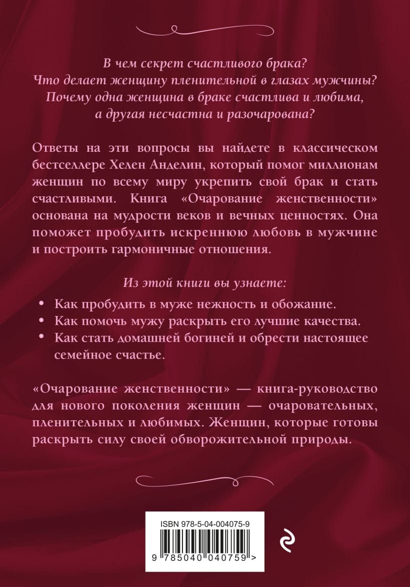 В чем секрет счастливого брака? Что делает женщину пленительной в глазах мужчины? Почему одна женщина в браке счастлива и любима, а другая несчастна и разочарована? Ответы на эти вопросы вы найдете в классическом бестселлере Хелен Анделин, который помог миллионам женщин по всему миру укрепить свой брак и стать счастливыми. Эта книга предлагает каждой женщине возможность освоить искусство завоевания абсолютной любви и обожания своего мужчины.