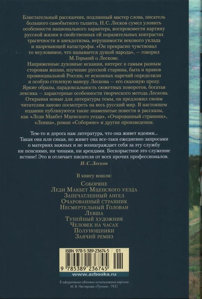 «Он прекрасно чувствовал то неуловимое, что называется „душой народа“», — сказал М. Горький об авторе знаменитых «Левши», «Очарованного странника», «Леди Макбет Мценского уезда». Самобытный талант Лескова заставляет задуматься о загадочной русской душе, о парадоксах и противоречиях национального характера. Напряженные духовные искания, интерес к самым разным сторонам жизни, глубинное знание быта, бесконечное разнообразие сюжетов и ситуаций — все эти черты творчества Лескова нашли отражение в произведениях, включенных в настоящий сборник. Открывая новые для литературы темы, Лесков предложил своим читателям заново посмотреть на весь русский мир.