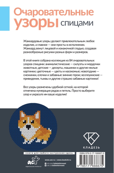 В этой книге собрана коллекция из 84 очаровательных узоров спицами: анималистические — силуэты и мордочки животных; детские — десерты, машинки и другие милые картинки; цветочные — цветы и насекомые; новогодние — снежинки, елочки и забавные зимние герои; хеллоуинсие — привидения, тыквы и другие страшно забавные картинки!