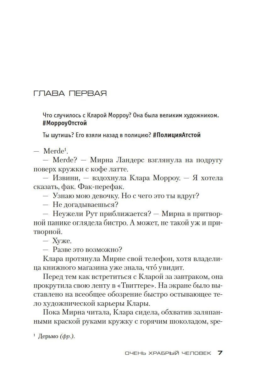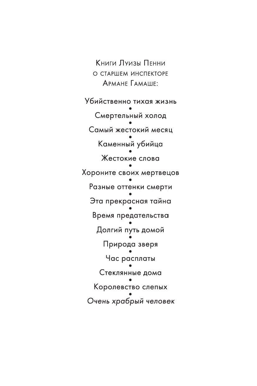 Роман «Очень храбрый человек» продолжает серию расследований старшего инспектора Армана Гамаша. Этот обаятельный персонаж создан пером Луизы Пенни, единственного в мире пятикратного лауреата премии Агаты Кристи. «Сегодня первый день Армана Гамаша в Квебекской полиции, куда он вернулся после девятимесячного отстранения, последовавшего за рядом необдуманных, пагубных решений» — пишут в «Твиттере» недоброжелатели — нет, явные враги Гамаша. Тем не менее в полиции знают: он лучший. Он умеет действовать отчаянно дерзко, рискованно и, что бы там ни писали в твитах, в высшей степени эффективно. Именно таких решений требуют от старшего инспектора события, обрушившиеся на него в первый же рабочий день. Пропала молодая беременная женщина, и он берется за расследование, испытывая глубокое (и возможно, неразумное) сочувствие к ее отцу, ведь у инспектора тоже есть взрослая дочь! Тем временем провинции Квебек угрожает весеннее наводнение эпического масштаба. Надвигающаяся катастрофа всегда несет с собой хаос, и Арман Гамаш пытается ему противостоять. Отложить поиски пропавшей, как считает его зять — тоже старший инспектор полиции, — и заняться более насущными вопросами перед лицом стихийного бедствия? Нет. «Сражение можно выиграть на одном фронте, — заявляет Гамаш. — Но война выигрывается на многих». Лед на реках уже тронулся, трещат мостовые опоры, в Сети запущено видео, порочащее честь Армана Гамаша… Успеет ли он выиграть свою войну? Впервые на русском!
