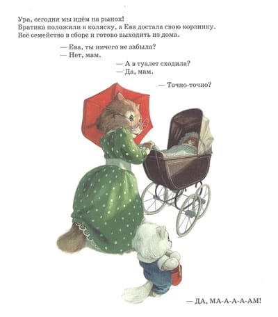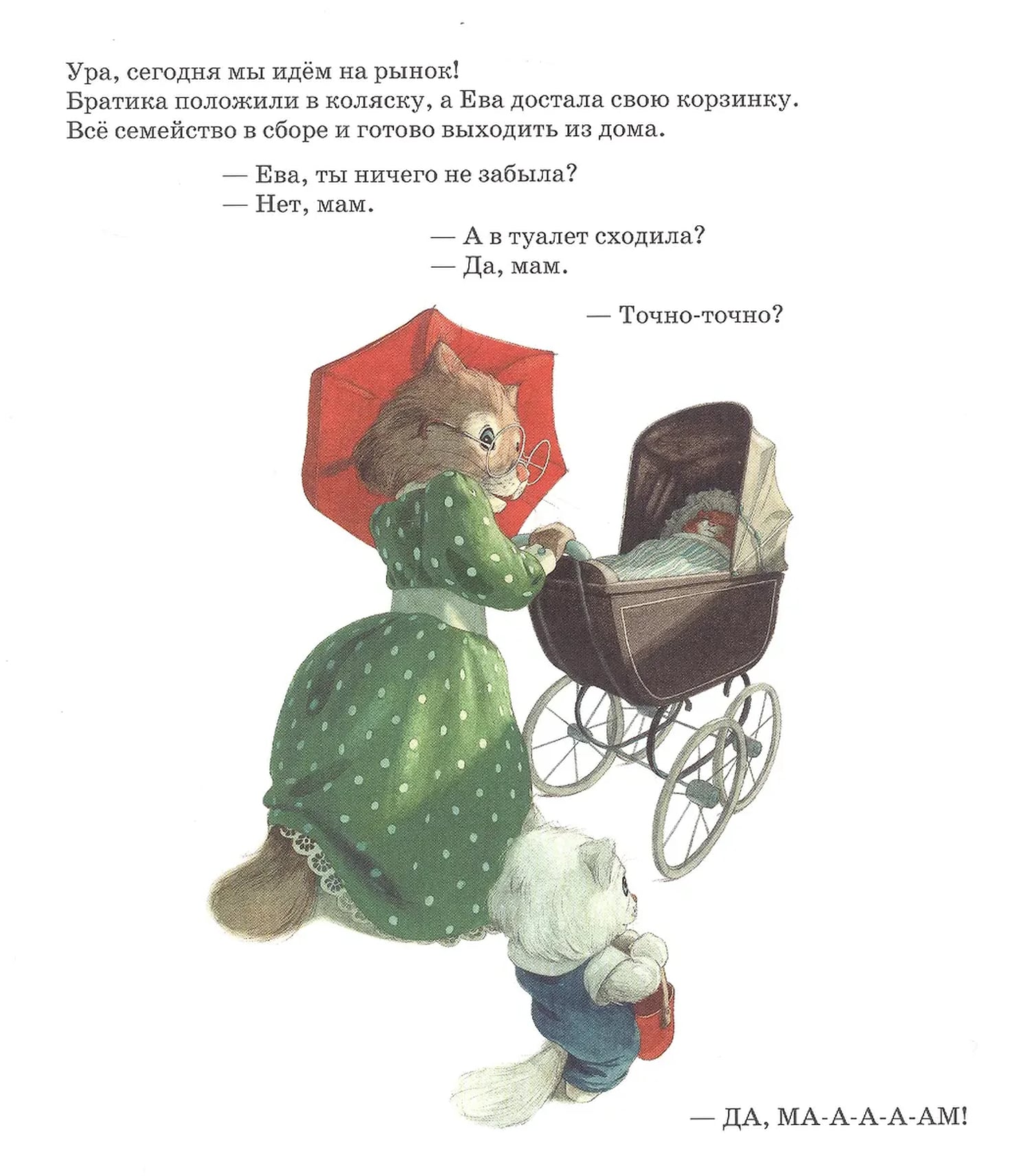 Пальто застегнуто, братик в коляске, любимая корзинка в руках. Всё семейство в сборе и готово выходить из дома! Ничего не забыли? Вроде бы нет. Только у малышки Евы появляется очень срочное дело и терпеть совсем нет сил!