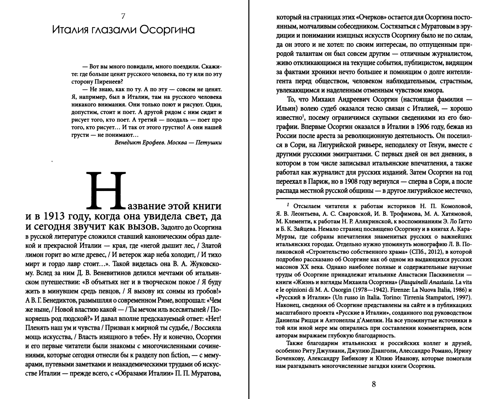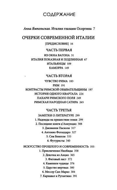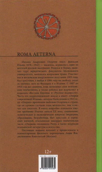 Михаил Андреевич Осоргин (наст. фамилия Ильин; 1878-1942) — писатель, журналист, один из деятелей русской эмиграции. Родился в Перми, окончил курс юридического факультета Московского университета, занимался вопросами права. Участвовал в московском вооруженном восстании 1905 года, был арестован, а выйдя в 1906 году на свободу, уехал за границу, жил во Франции и в Италии. С 1907 по 1916 год вел дневник, куда записывал свои итальянские впечатления, а также работал как журналист в изданиях «Вестник Европы» и «Русские ведомости». Часть его корреспонденций вошла в книгу «Очерки современной Италии», которая была издана в 1913 году. «Очерки» пронизаны любовью Осоргина к стране, где он прожил «лучшие годы молодости», как отмечал сам писатель. В книге подробно освещены многие проблемы Италии начала ХХ века, социальные, политические и экономические вопросы (медицина, образование, безработица, быт крестьян и городских жителей, итальянская каморра); значительная часть «Очерков» посвящена Риму, а также вопросам итальянской литературы и искусства. Настоящее издание выходит с предисловием и комментариями филолога, переводчика Анны Владиславовны Ямпольской (Москва).