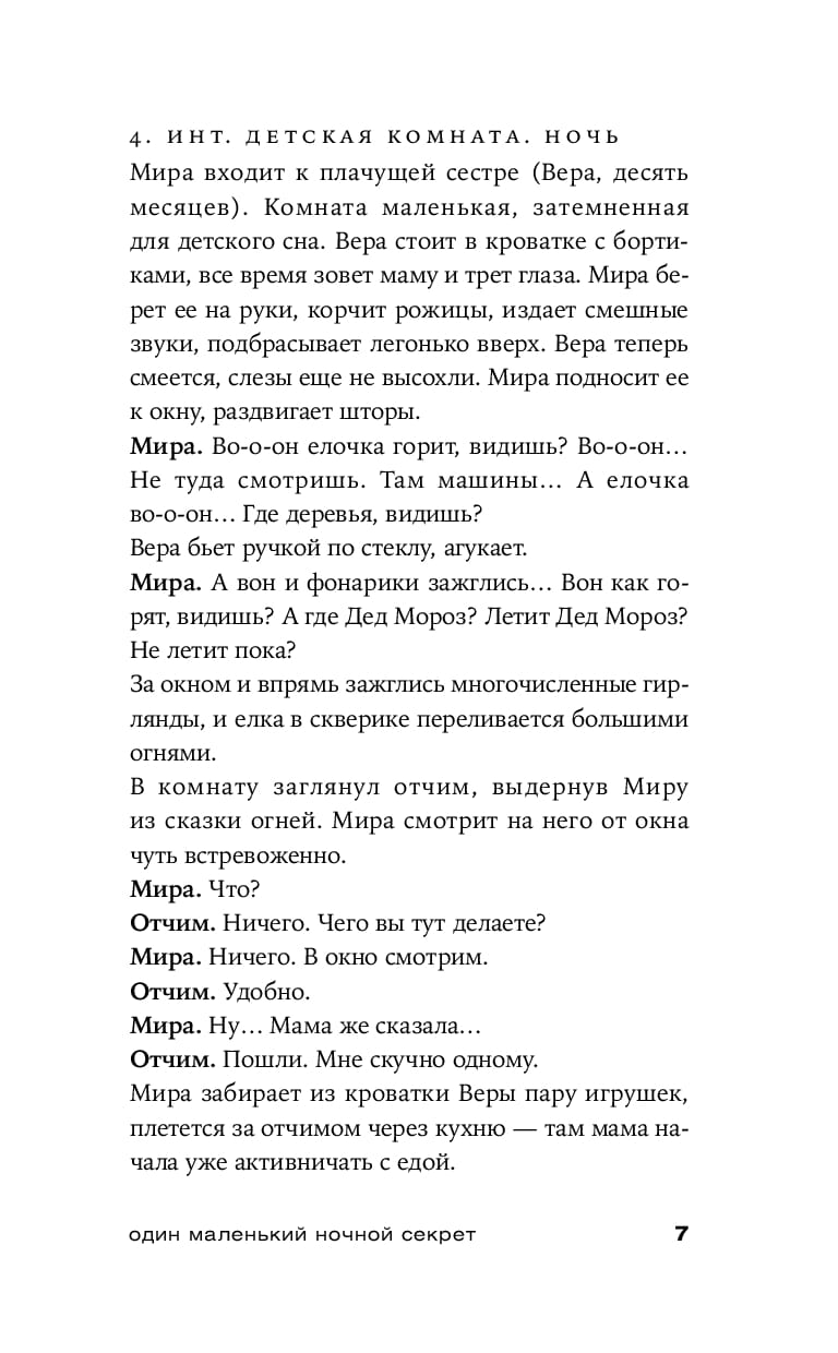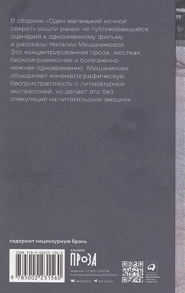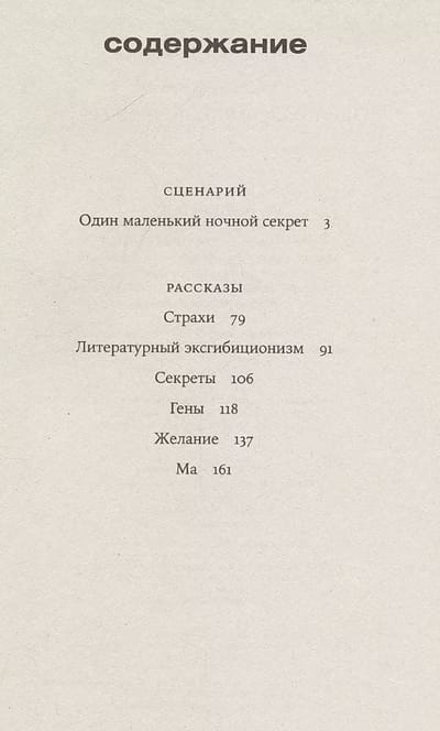 В сборник «Один маленький ночной секрет» вошли ранее не публиковавшийся сценарий к одноименному фильму и рассказы Наталии Мещаниновой.