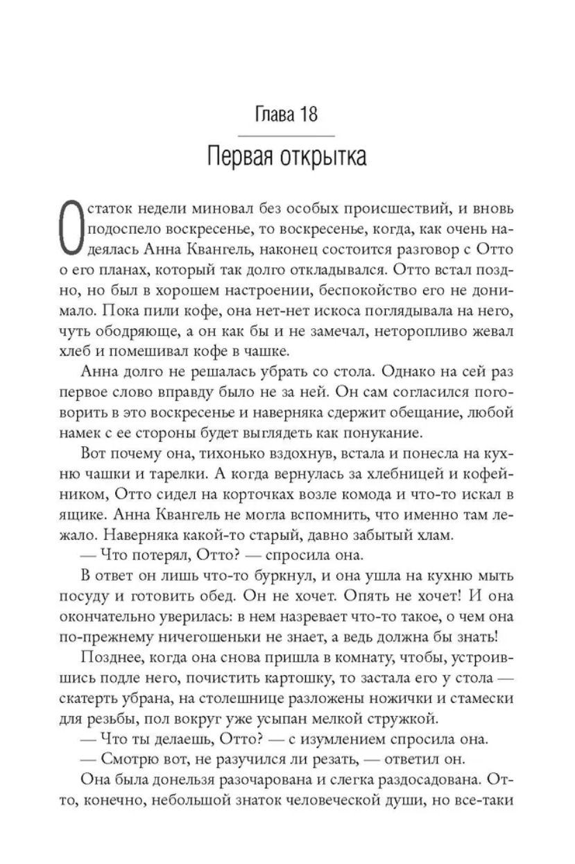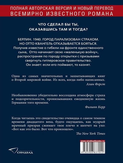 Историю Квангелей Фаллада не выдумал: открытки сохранились в архивах гестапо. Книга была написана по горячим следам, в 1947 году, и увидела свет уже после смерти автора. Несмотря на то, что текст подвергся существенной цензурной правке, роман имел оглушительный успех: он был переведен на множество языков, лег в основу четырех экранизаций и большого числа театральных постановок в разных странах. Более чем полвека спустя вышло второе издание романа - очищенное от конъюнктурной правки.