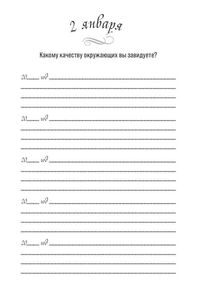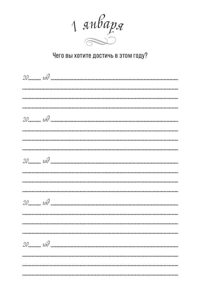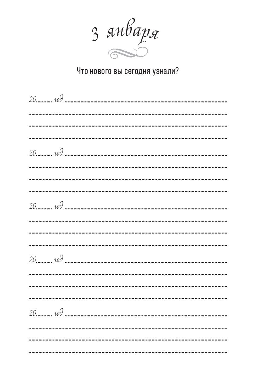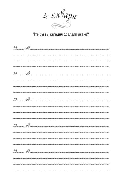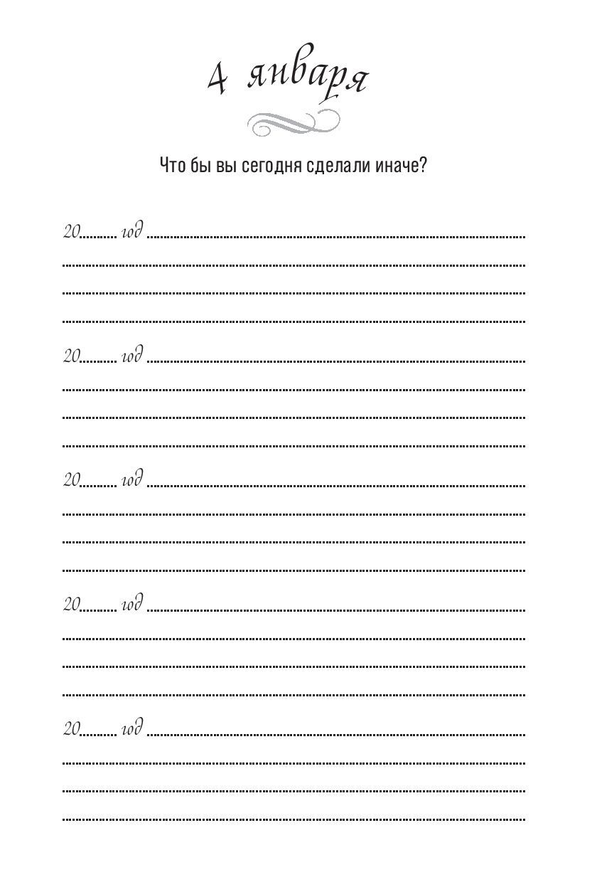 На каждой странице этого пятибука вы найдете вопрос, отвечая на который каждый год в один и тот же день, вы сможете проанализировать изменения своего состояния и мыслей. Здесь собраны разные вопросы — от прозаических до тех, которые касаются смысла жизни. Ежедневник поможет расслабиться после напряженного дня, отдохнуть, привести мысли в порядок, а также повысить осознанность, научиться фиксировать мысли и эмоции.