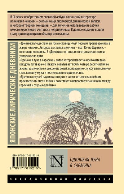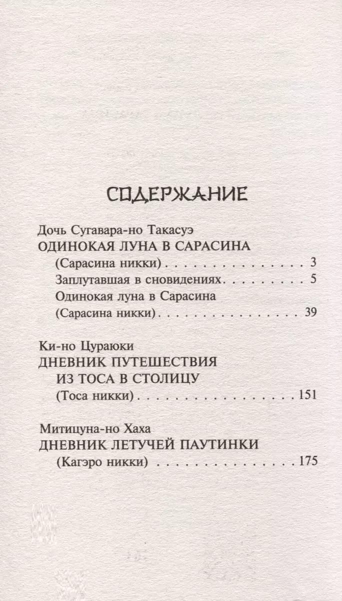 «Одинокая луна в Сарасина», автор которой известна исключительно как дочь Сугавара-но Такасуэ, охватывает почти четыре десятилетия ее жизни: замужество и рождение детей, придворную службу и паломничество, кончину мужа и последовавшее одиночество.