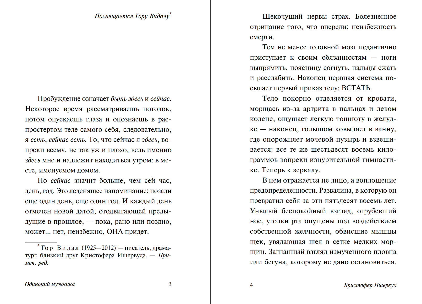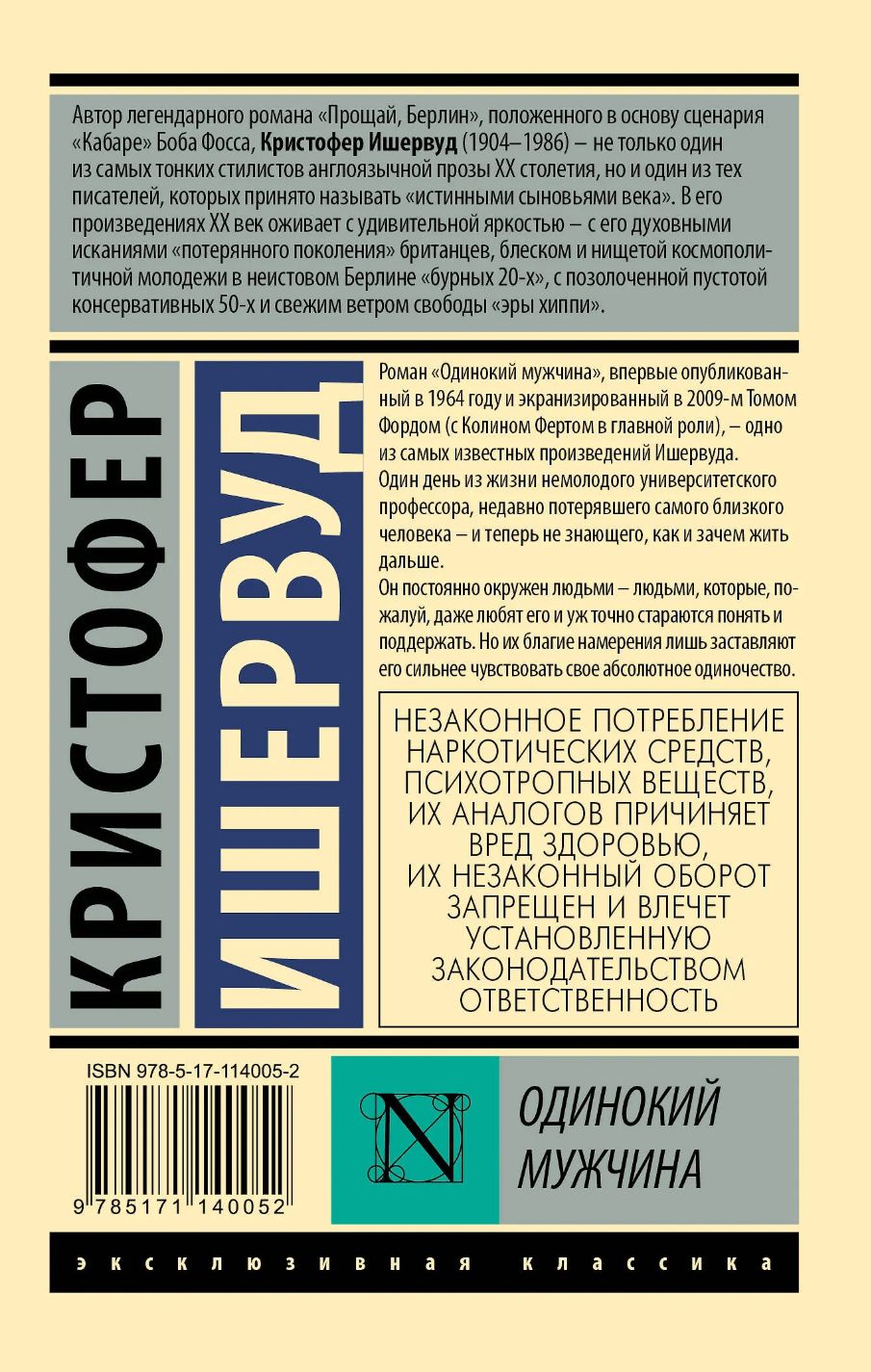 Роман «Одинокий мужчина», впервые опубликованный в 1964 году и экранизированный в 2009-м Томом Фордом (с Колином Фертом в главной роли), — одно из самых известных произведений Ишервуда. Один день из жизни немолодого университетского профессора, недавно потерявшего самого близкого человека — и теперь не знающего, как и зачем жить дальше. Он постоянно окружен людьми — людьми, которые, пожалуй, даже любят его и уж точно стараются понять и поддержать. Но их благие намерения лишь заставляют его тем сильнее чувствовать свое абсолютное одиночество.