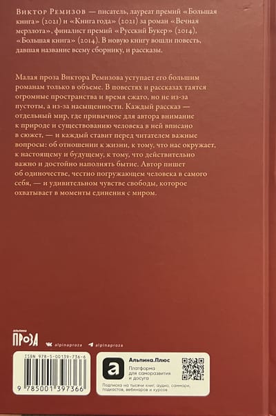 Малая проза Виктора Ремизова уступает его большим романам только в объеме. В повестях и рассказах таятся огромные пространства и время сжато, но не из-за пустоты, а из-за насыщенности. Каждый рассказ — отдельный мир, где привычное для автора внимание к природе и существованию человека в ней вписано в сюжет, — и каждый ставит перед читателем важные вопросы: об отношении к жизни, к тому, что нас окружает, к настоящему и будущему, к тому, что действительно важно и достойно наполнять бытие. Автор пишет об одиночестве, честно погружающем человека в самого себя, — и удивительном чувстве свободы, которое охватывает в моменты единения с миром.