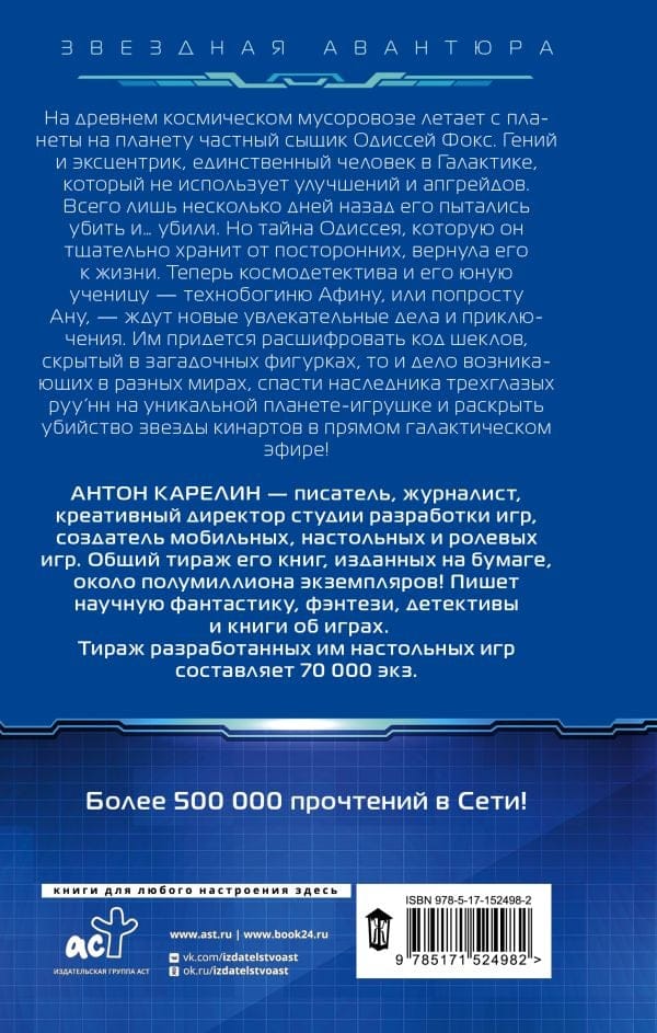 На древнем космическом мусоровозе летает с планеты на планету частный сыщик Одиссей Фокс. Гений и эксцентрик, единственный человек в Галактике, который не использует улучшений и апгрейдов. Всего лишь несколько дней назад его пытались убить и… убили. Но тайна Одиссея, которую он тщательно хранит от посторонних, вернула его к жизни. Теперь космодетектива и его юную ученицу — технобогиню Афину, или попросту Ану, — ждут новые увлекательные дела и приключения. Им придется расшифровать код шеклов, скрытый в загадочных фигурках, то и дело возникающих в разных мирах, спасти наследника трехглазых руу’нн на уникальной планете-игрушке и раскрыть убийство звезды кинартов в прямом галактическом эфире!