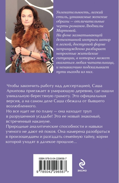 Чтобы закончить работу над диссертацией, Саша Архипова приезжает в умирающую деревню, где нашли уникальную берестяную грамоту. Это официальная версия, а на самом деле Саша сбежала от бывшего возлюбленного. Но все идет не по плану — она находит труп в разрушенной усадьбе! Это ее новый знакомый, встреченный накануне. Природные аналитические способности и навыки ученого не дают ей покоя. Она намерена разобраться в произошедшем и разгадать семейную тайну, корни которой уходят в далекое прошлое…