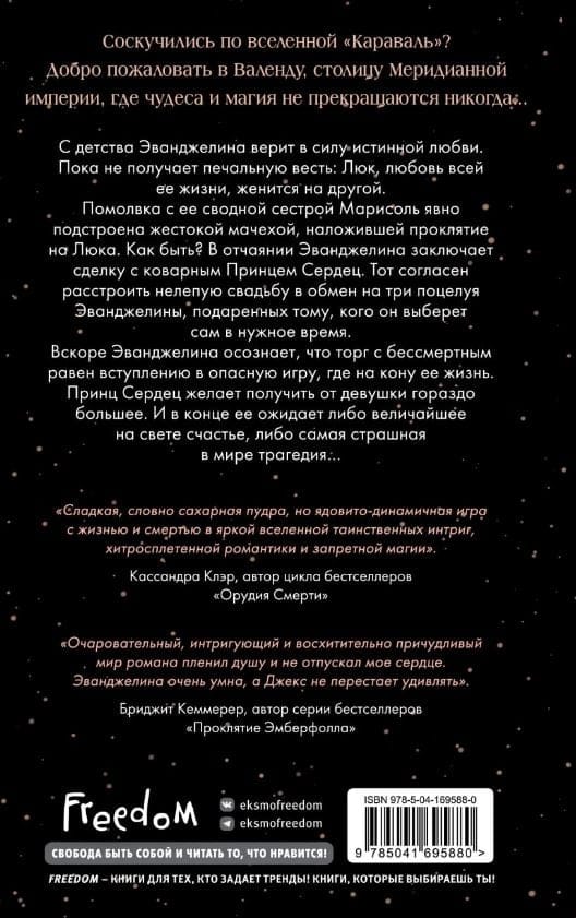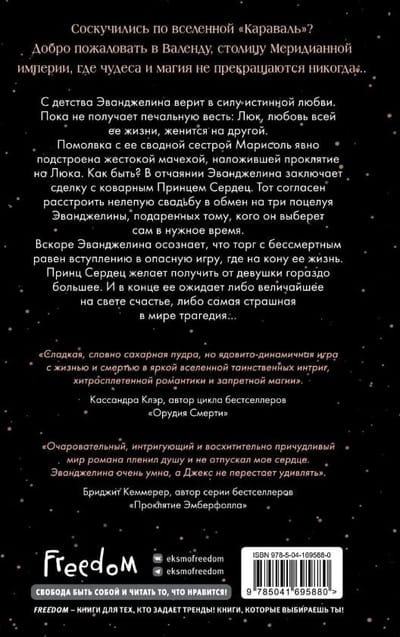 С детства Эванджелина верит в силу истинной любви. Пока не получает печальную весть: Люк, любовь всей ее жизни, женится на другой. Помолвка с ее сводной сестрой Марисоль явно связана с проклятием жестокой мачехи. Как быть? В отчаянии Эванджелина заключает сделку с коварным Принцем Сердец. Принц согласен расстроить нелепую свадьбу в обмен на три поцелуя Эванджелины, подаренных тому, кого он выберет сам в нужное время. Вскоре Эванджелина осознает, что торг с бессмертным равен вступлению в опасную игру, где на кону ее жизнь. Принц Сердец желает получить от девушки гораздо большее. И в конце ее ожидает либо величайшее на свете счастье, либо самая страшная в мире трагедия…