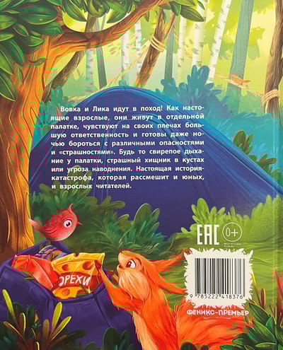 Вовка и Лика идут в поход! Как настоящие взрослые, они живут в отдельной палатке, чувствуют на своих плечах большую ответственность и готовы даже ночью бороться с различными опасностями и «страшностями». Будь то свирепое дыхание у палатки, страшный хищник в кустах или угроза наводнения. Настоящая история-катастрофа, которая рассмешит и юных, и взрослых читателей.