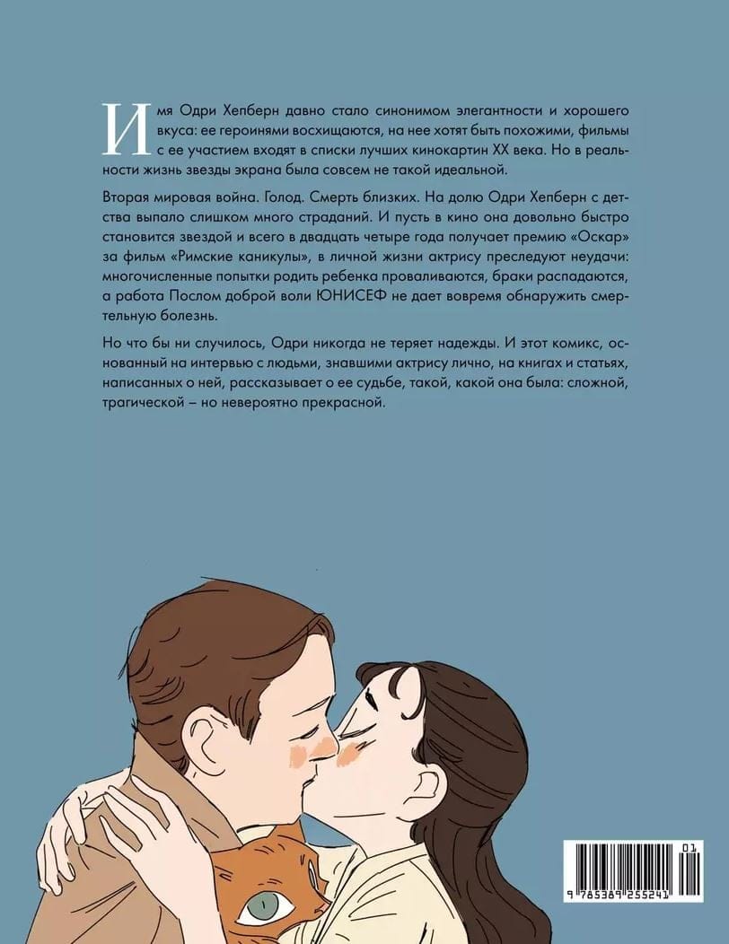Имя Одри Хепберн давно стало синонимом элегантности и хорошего вкуса: ее героинями восхищаются, на нее хотят быть похожими, фильмы с ее участием входят в списки лучших кинокартин XX века. Но в реальности жизнь звезды экрана была совсем не такой идеальной. Вторая мировая война. Голод. Смерть близких. На долю Одри Хепберн с детства выпало слишком много страданий. И пусть в кино она довольно быстро становится звездой и всего в двадцать четыре года получает премию Оскар за фильм «Римские каникулы», в личной жизни актрису преследуют неудачи: многочисленные попытки родить ребенка проваливаются, браки распадаются, а работа Послом доброй воли ЮНИСЕФ не дает вовремя обнаружить смертельную болезнь. Но что бы ни случилось, Одри никогда не теряет надежды. И этот комикс, основанный на интервью с людьми, знавшими актрису лично, на книгах и статьях, написанных о ней, рассказывает о ее судьбе, такой, какой она была: сложной, трагической — но невероятно прекрасной.