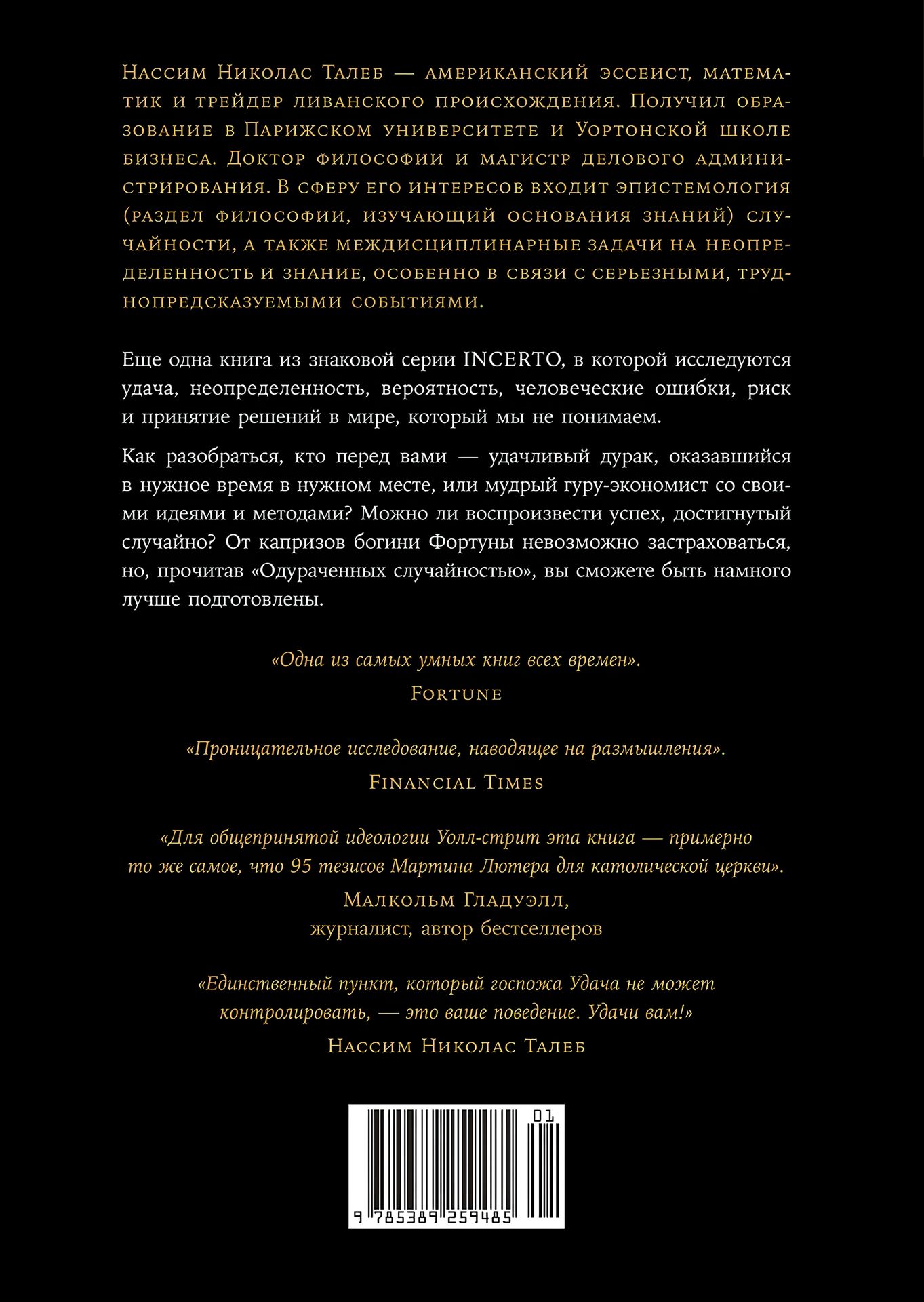 Случайность, удача, шанс, неопределенность, вероятность, человеческие ошибки, риск и принятие решений в мире, который мы не понимаем, — неисчерпаемые в своей многогранности темы, которые исследует успешный трейдер, математик и философ Нассим Талеб, подготавливая нас к достойной встрече лицом к лицу с вызовами и непредвиденными событиями любого рода.