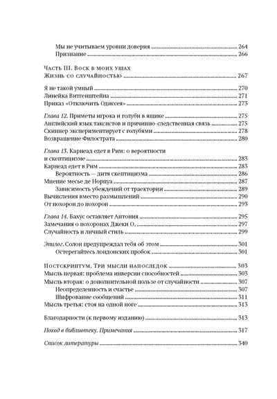 «Вероятность — не столько вычисление шансов при бросании костей, сколько признание недостатка определенности в наших знаниях и развитие методов обращения с нашим неведением. За пределами учебников и казино вероятность почти никогда не предстает в виде математической задачи или загадки для ума. Мать-природа не скажет вам, сколько лунок есть на столе для игры в рулетку, да и задачи она формулирует не в том стиле, который принят в учебниках (в реальном мире приходится искать проблему, а не решение). Вероятностное мышление, лежащее в основе этой книги, предполагает, что, если бы осуществились альтернативные исходы, мир был бы другим».(Н.Талеб)
