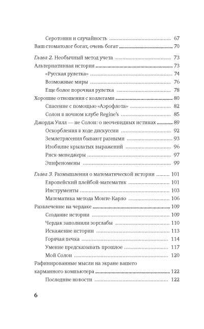 «Вероятность — не столько вычисление шансов при бросании костей, сколько признание недостатка определенности в наших знаниях и развитие методов обращения с нашим неведением. За пределами учебников и казино вероятность почти никогда не предстает в виде математической задачи или загадки для ума. Мать-природа не скажет вам, сколько лунок есть на столе для игры в рулетку, да и задачи она формулирует не в том стиле, который принят в учебниках (в реальном мире приходится искать проблему, а не решение). Вероятностное мышление, лежащее в основе этой книги, предполагает, что, если бы осуществились альтернативные исходы, мир был бы другим». (Н.Талеб)
