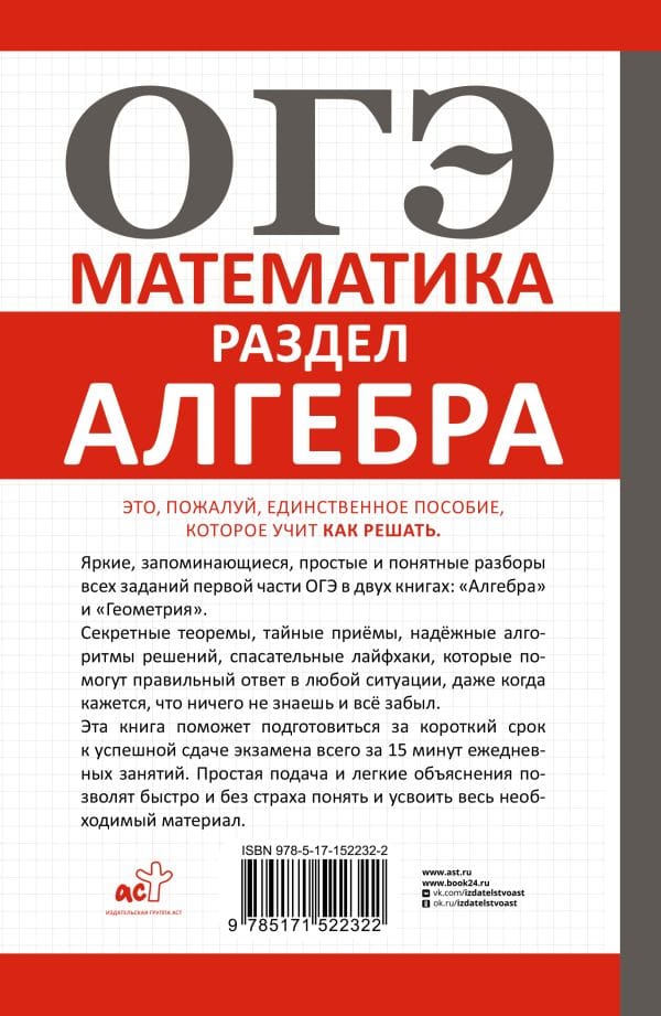 Книга, которая спасает детей! Пособие от популярного учителя и блогера Петра Земскова «ОГЭ. Алгебра» ориентирована на школьников, которые ничего не понимают в математике, но хотят сдать ОГЭ на хороший балл. Внутри – изложенная в максимально простой и четкой форме теория, которая превратит двоечника как минимум в хорошиста. Если что-то будет непонятным, вы сможете перейти по QR-кодам, размещенным в книге.