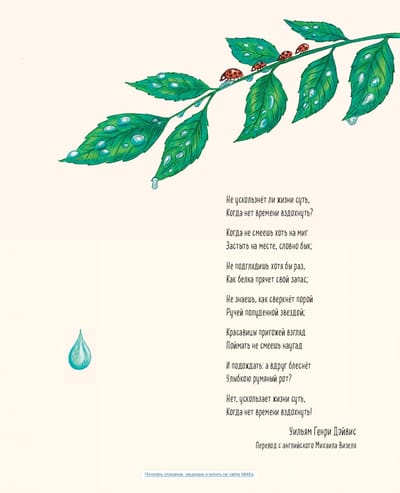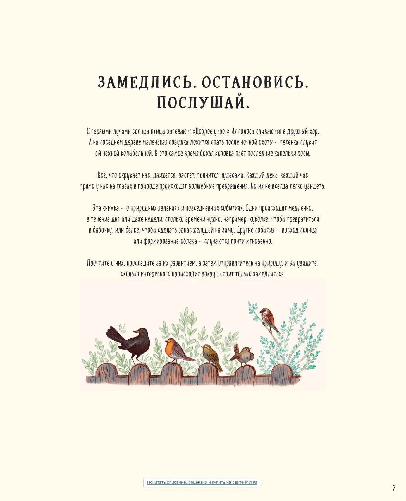 Философия замедления актуальна сегодня, как никогда прежде. Позвольте себе вдохнуть воздух полной грудью, остановиться, оглядеться вокруг... и увидеть, как прекрасна жизнь! Пригласите детей вместе с вами понаблюдать, как падает звезда, цветет вишня и взлетает божья коровка. Научите детей уже сегодня обращать внимание на чудеса, которые каждый день происходят вокруг нас.
