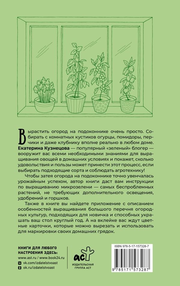 Вырастить огород на подоконнике очень просто. Собирать с комнатных кустиков огурцы, помидоры, перчики и даже клубнику вполне реально в любом доме. Екатерина Кузнецова — популярный «зеленый» блогер — вооружит вас всеми необходимыми знаниями для выращивания овощей в домашних условиях и покажет, сколько удовольствия и пользы может принести этот процесс, если выбирать подходящие сорта и соблюдать агротехнику! Чтобы затея огорода на подоконнике точно увенчалась урожайным успехом, автор книги даст вам инструкции по выращиванию микрозелени — самых беспроблемных растений, не требующих дополнительного освещения, удобрений и горшков. Также в книге вы найдете приложение с описанием особенностей выращивания большого перечня огородных культур, подходящих для новичка и способных украшать ваш стол круглый год. А на цветной вклейке вас ждут карточки-шпаргалки, которые можно вырезать и использовать для создания домашнего огорода своей мечты.