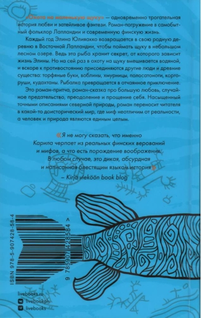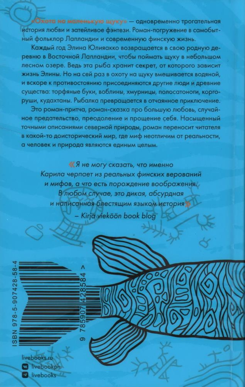 «Охота на маленькую щуку» — одновременно трогательная история любви и затейливое фэнтези. Роман-погружение в самобытный фольклор Лапландии и современную финскую жизнь. Каждый год Элина Юлияакко возвращается в свою родную деревню в Восточной Лапландии, чтобы поймать щуку в небольшом лесном озере. Ведь эта рыба хранит секрет, от которого зависит жизнь Элины. Но на сей раз в охоту на щуку вмешивается водяной, и вскоре к противостоянию присоединяются другие люди и древние существа: торфяные буки, воблины, хмурницы, полосатоноги, коргоруши, кудахтаны. Рыбалка превращается в отчаянное приключение. Это роман-притча, роман-сказка про большую любовь, случайное предательство, преодоление и прощение себя. Насыщенный точными описаниями северной природы, роман переносит читателя в какой-то доисторический мир, где миф неотличим от реальности, а человек и природа являются единым целым.