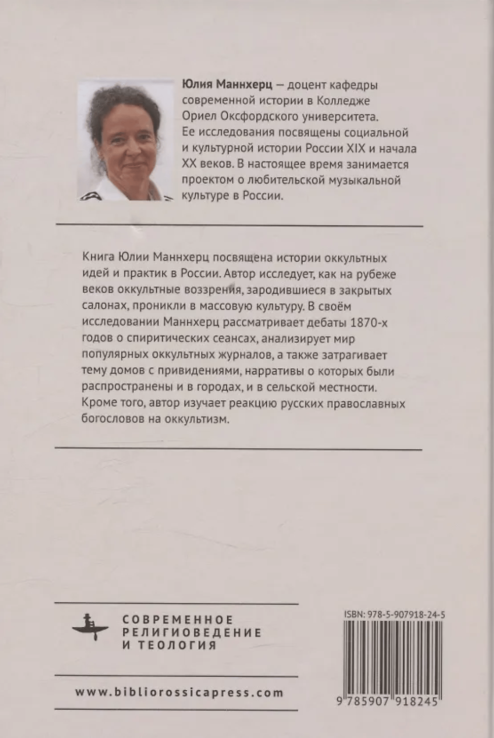 Книга Юлии Маннхерц посвящена истории оккультных идей и практик в России. Автор исследует, как на рубеже веков оккультные воззрения, зародившиеся в закрытых салонах, проникли в массовую культуру. В своём исследовании Маннхерц рассматривает дебаты 1870-х годов о спиритических сеансах, анализирует мир популярных оккультных журналов, а также затрагивает тему домов с привидениями, нарративы о которых были распространены и в городах, и в сельской местности. Кроме того, автор изучает реакцию русских православных богословов на оккультизм.