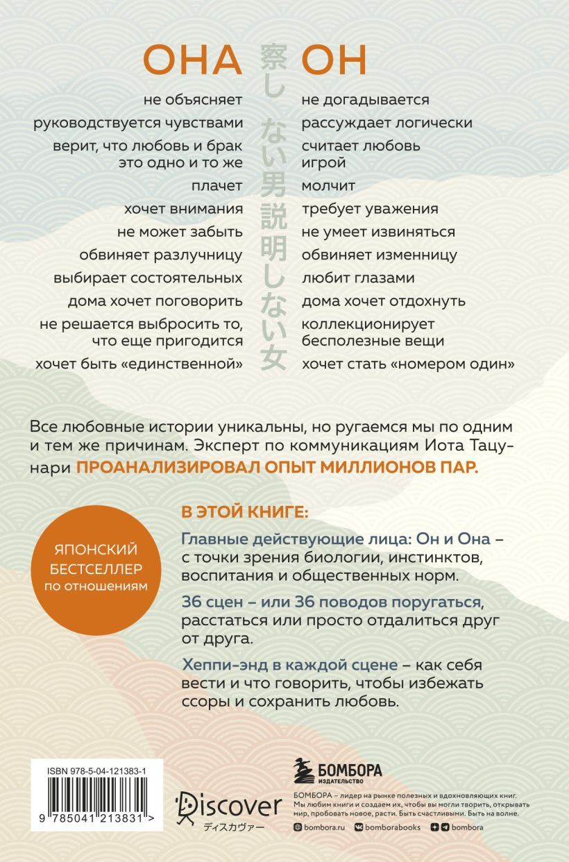 Книга. Она не объясняет, он не догадывается. Японское искусство диалога без ссор. И.Тацунари. Им движет логика, ей управляют чувства. Он любит помолчать, она – поговорить. Для него любовь – это игра, для нее – брак. Он расслабляется, она раздражается. Он не умеет извиняться, она не может забыть.