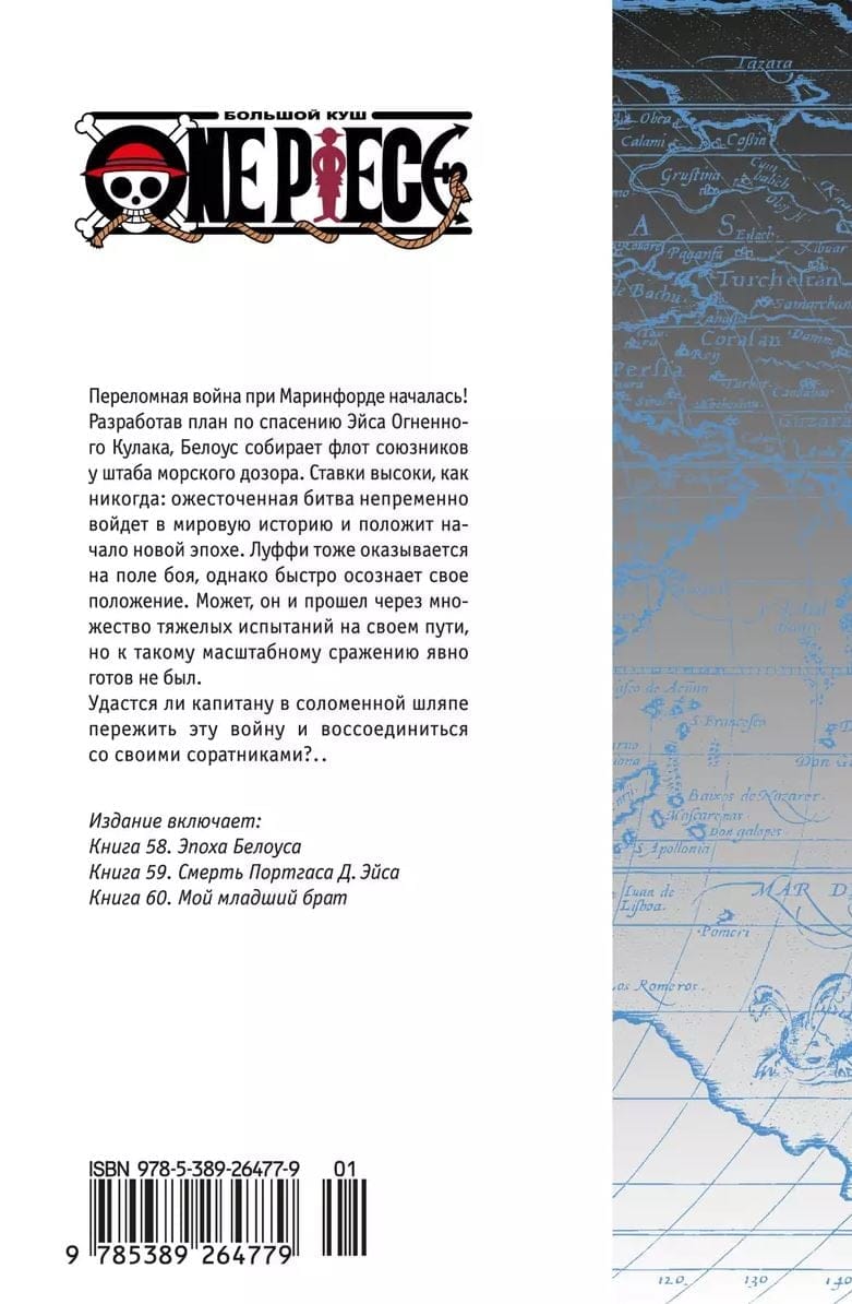 Переломная война при Маринфорде началась! Разработав план по спасению Эйса Огненного Кулака, Белоус собирает флот союзников у штаба морского дозора. Ставки высоки, как никогда: ожесточенная битва непременно войдет в мировую историю и положит начало новой эпохе. Луффи тоже оказывается на поле боя, однако быстро осознает свое положение. Может, он и прошел через множество тяжелых испытаний на своем пути, но к такому масштабному сражению явно готов не был. Удастся ли капитану в соломенной шляпе пережить эту войну и воссоединиться со своими соратниками?.. Издание включает: Книга 58. Эпоха Белоуса Книга 59. Смерть Портгаса Д. Эйса Книга 60. Мой младший брат.