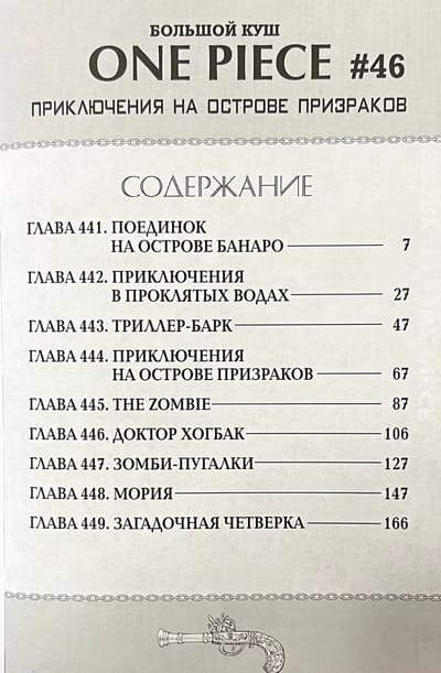 Путешествие Луффи и его соратников продолжается! Освободив Нико Робин из плена СП9, пиратская шайка вновь отправляется в плавание: их следующая остановка – остров Рыболюдей. Однако в море экипаж встречает непогода, и корабль заносит в загадочный Флорианский Треугольник, дьявольские воды, о которых ходит множество жутких легенд. И здесь на пути у команды Соломенной Шляпы возникает Триллер-Барк, плавучий остров призраков...