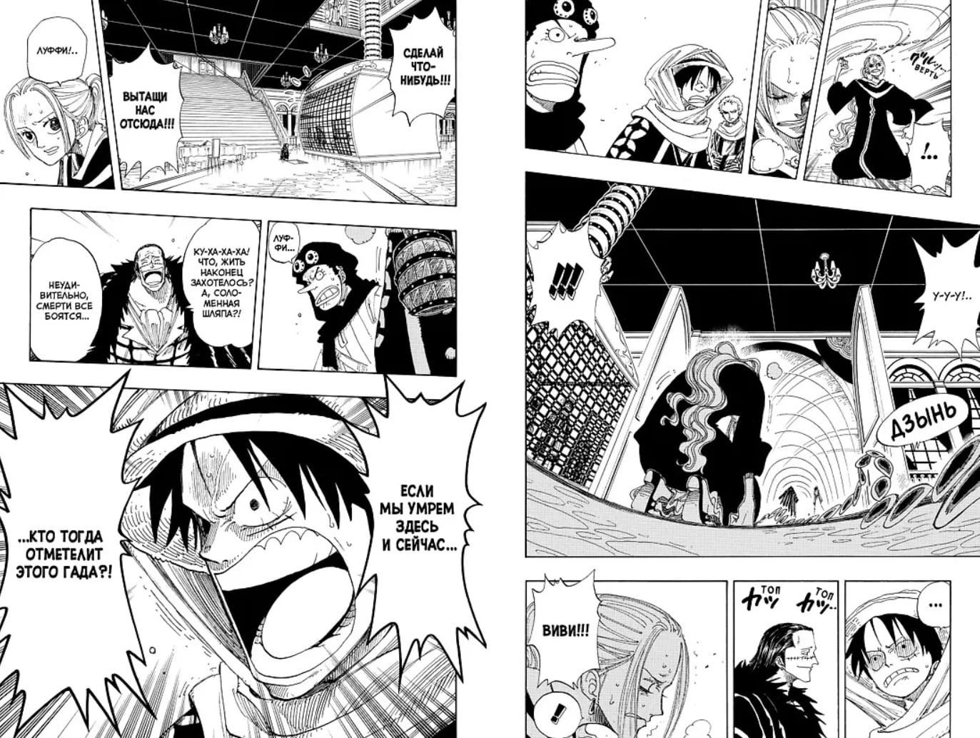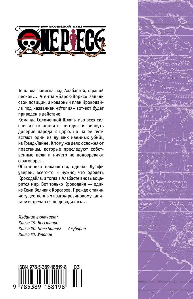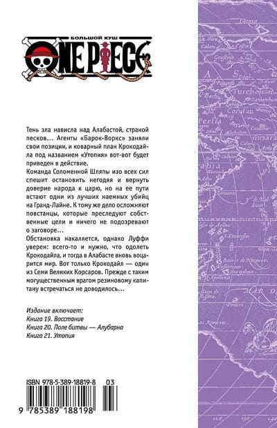 Тень зла нависла над Алабастой, страной песков… Агенты «Барок-Воркс» заняли свои позиции, и коварный план Крокодайла под названием «Утопия» вот-вот будет приведен в действие. Команда Соломенной Шляпы изо всех сил спешит остановить негодяя и вернуть доверие народа к царю, но на их пути встают одни из самых лучших наемных убийц на Гранд-Лайне. К тому же дело осложняют повстанцы, которые преследуют собственные цели и ничего не подозревают о заговоре… Обстановка накаляется, однако Луффи уверен: всего-то и нужно, что одолеть Крокодайла, и тогда в Алабасте вновь воцарится мир. Вот только Крокодайл – один из Семи Великих Корсаров. И с таким могущественным врагом резиновому капитану прежде встречаться не доводилось…