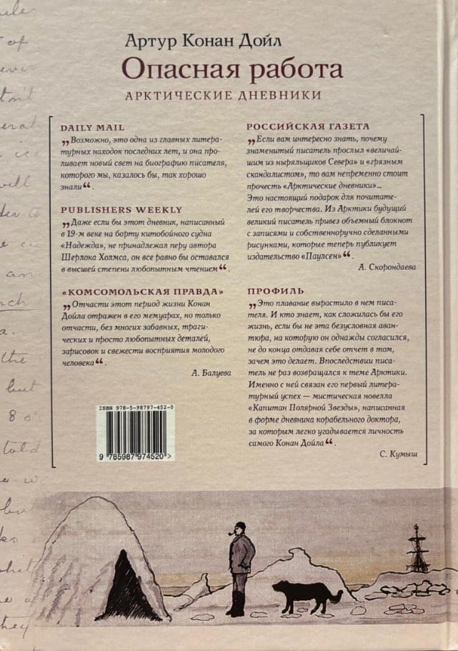 Книга «Опасная работа. Арктические дневники» была написана Артуром Конан Дойлом во время экспедиции в Арктику на китобойном судне. Весной 1880 года студент-медик Артур Конан Дойл получил неожиданное предложение — пойти в шестимесячное плавание на китобойном судне. Выбор между подготовкой к очередному экзамену и полярным приключением был недолгим. Из Арктики будущий великий писатель привез объемный блокнот с записями и собственноручно сделанными рисунками.
