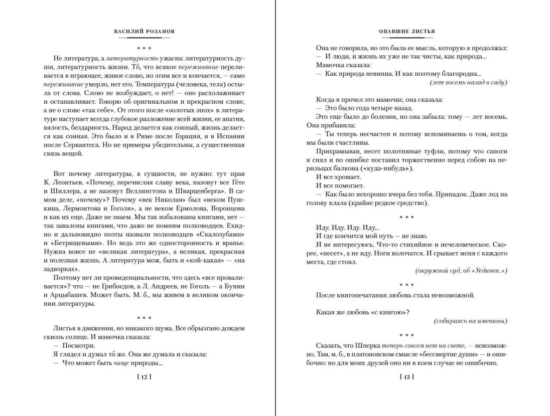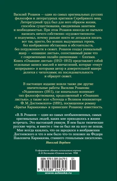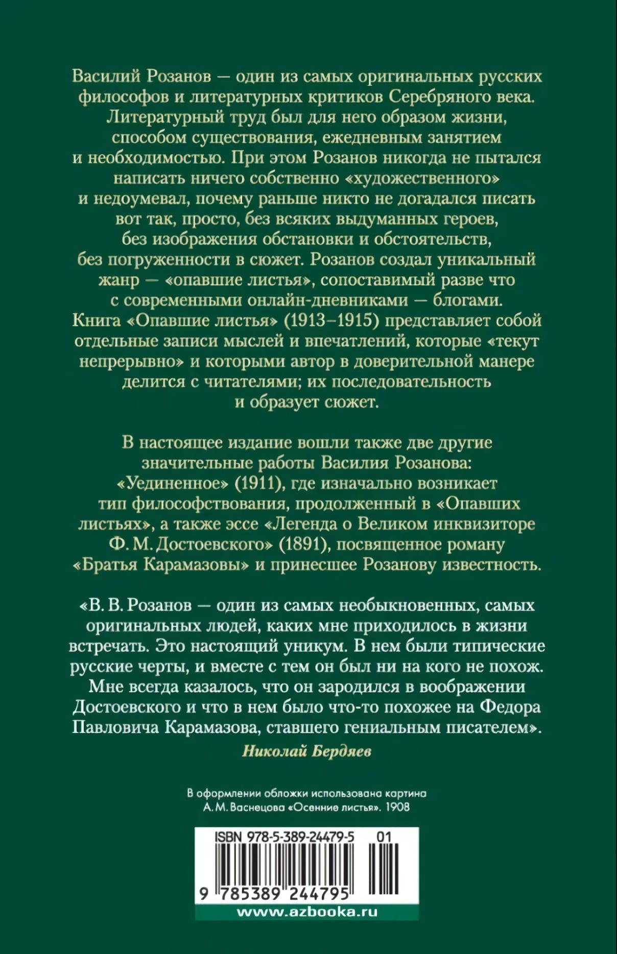 Василий Розанов — один из самых оригинальных русских философов и литературных критиков Серебряного века. Литературный труд был для него образом жизни, способом существования, ежедневным занятием и необходимостью. При этом Розанов никогда не пытался написать ничего собственно «художественного» и недоумевал, почему раньше никто не догадался писать вот так, просто, без всяких выдуманных героев, без изображения обстановки и обстоятельств, без погруженности в сюжет. Розанов создал уникальный жанр — «опавшие листья», сопоставимый разве что с современными онлайн-дневниками — блогами. Книга «Опавшие листья» (1913–1915) представляет собой отдельные записи мыслей и впечатлений, которые «текут непрерывно» и которыми автор в доверительной манере делится с читателями; их последовательность и образует сюжет. В настоящее издание вошли также две другие значительные работы Василия Розанова: «Уединенное» (1911), где изначально возникает тип философствования, продолженный в «Опавших листьях», а также эссе «Легенда о Великом инквизиторе Ф. М. Достоевского» (1891), посвященное роману «Братья Карамазовы» и принесшее Розанову известность.