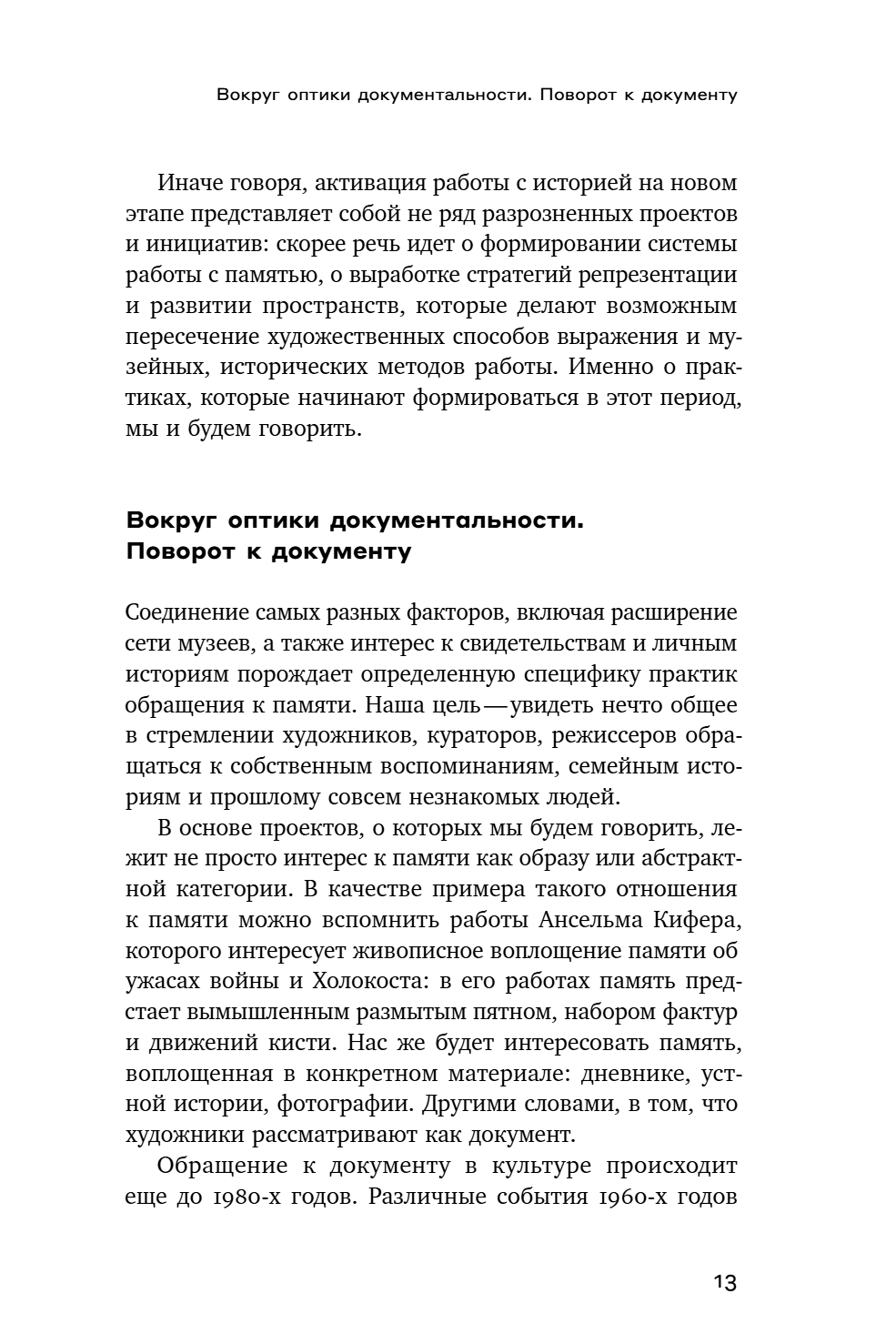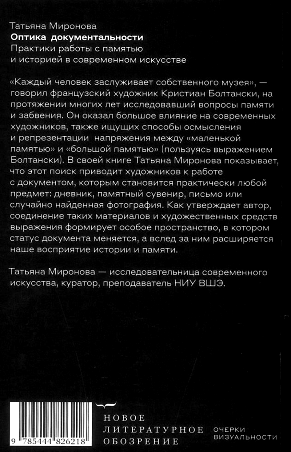 «Каждый человек заслуживает собственного музея», — говорил французский художник Кристиан Болтански, на протяжении многих лет исследовавший вопросы памяти и забвения. Он оказал большое влияние на современных художников, также ищущих способы осмысления и репрезентации напряжения между «маленькой памятью» и «большой памятью» (пользуясь выражением Болтански). В своей книге Татьяна Миронова показывает, что этот поиск приводит художников к работе с документом, которым становится практически любой предмет: дневник, памятный сувенир, письмо или случайно найденная фотография. Как утверждает автор, соединение таких материалов и художественных средств выражения формирует особое пространство, в котором статус документа меняется, а вслед за ним расширяется наше восприятие истории и памяти. Татьяна Миронова — исследовательница современного искусства, куратор, преподаватель НИУ ВШЭ.