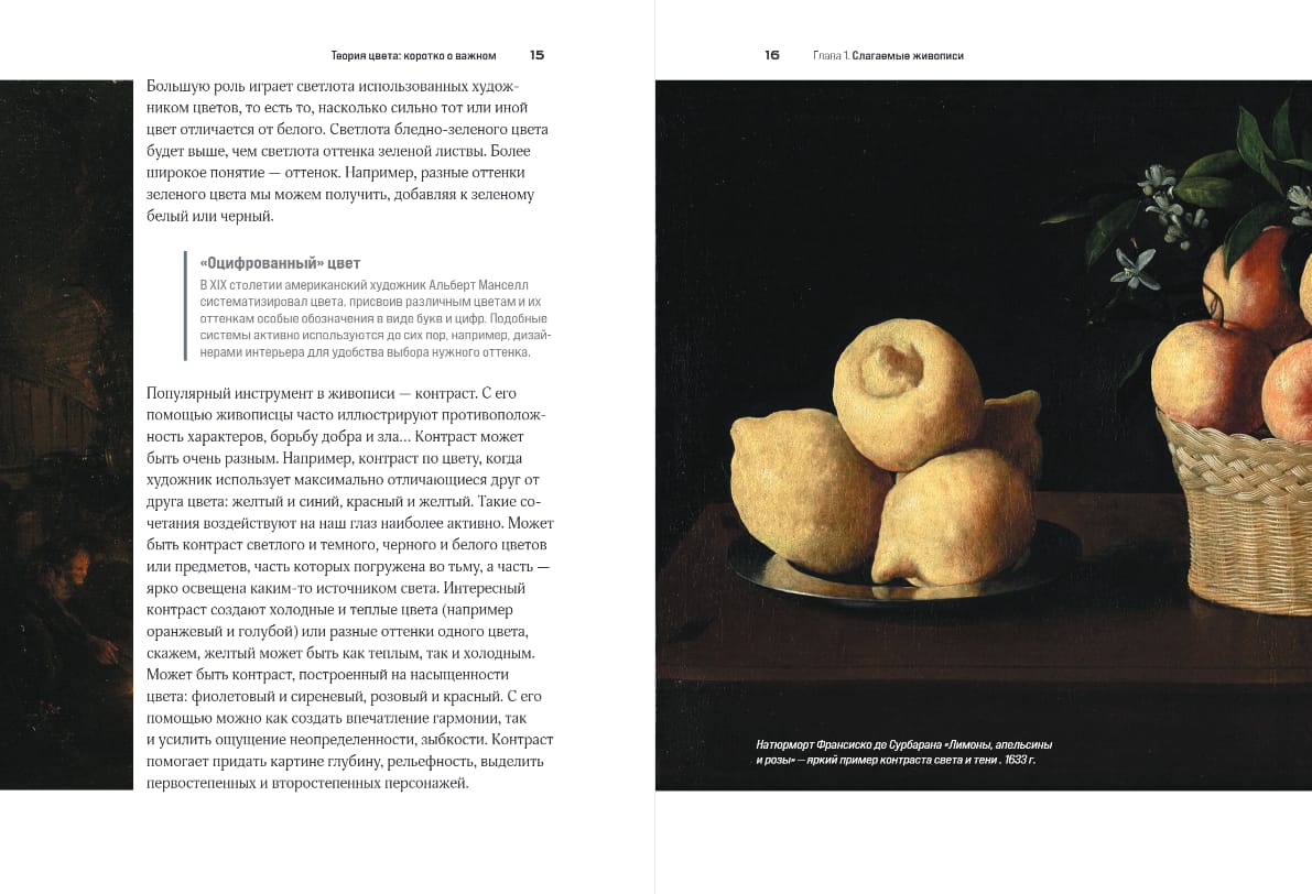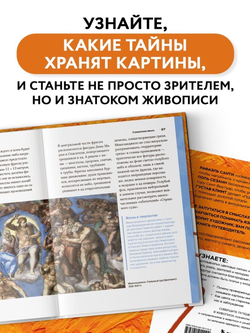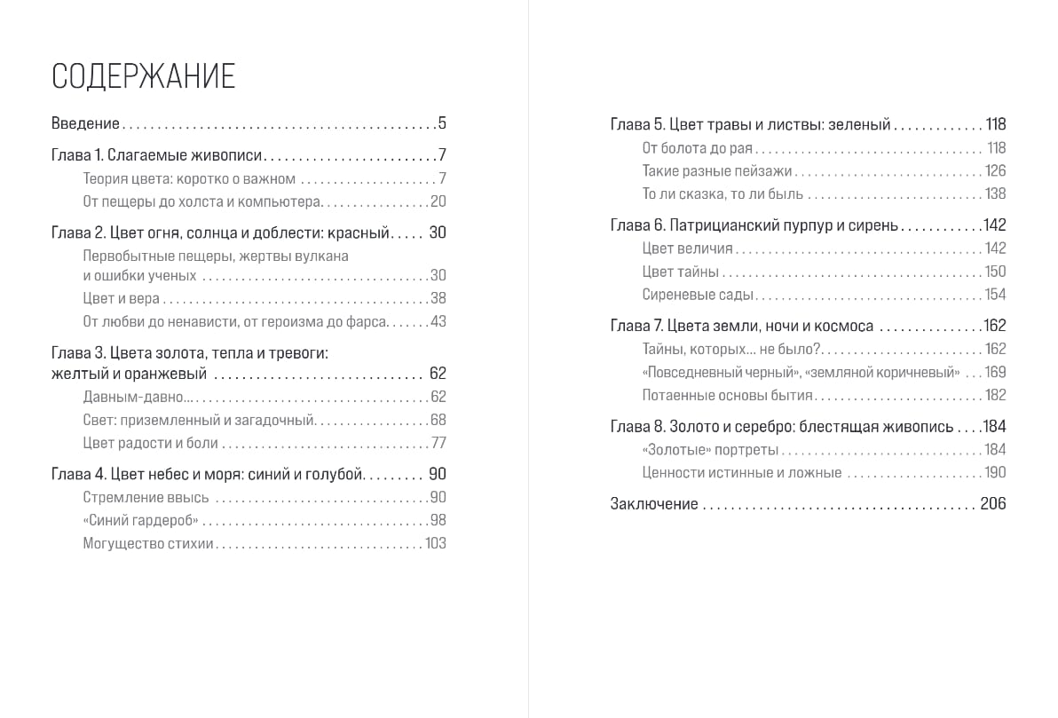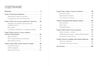 Автор подробно разбирает историю красного, желтого, синего, зеленого и других цветов на примере известных картин: «Мона Лиза», «Портрет четы Арнольфини», «Девушка с жемчужной сережкой», «Поцелуй», «Звездная ночь», «Рождение Венеры».