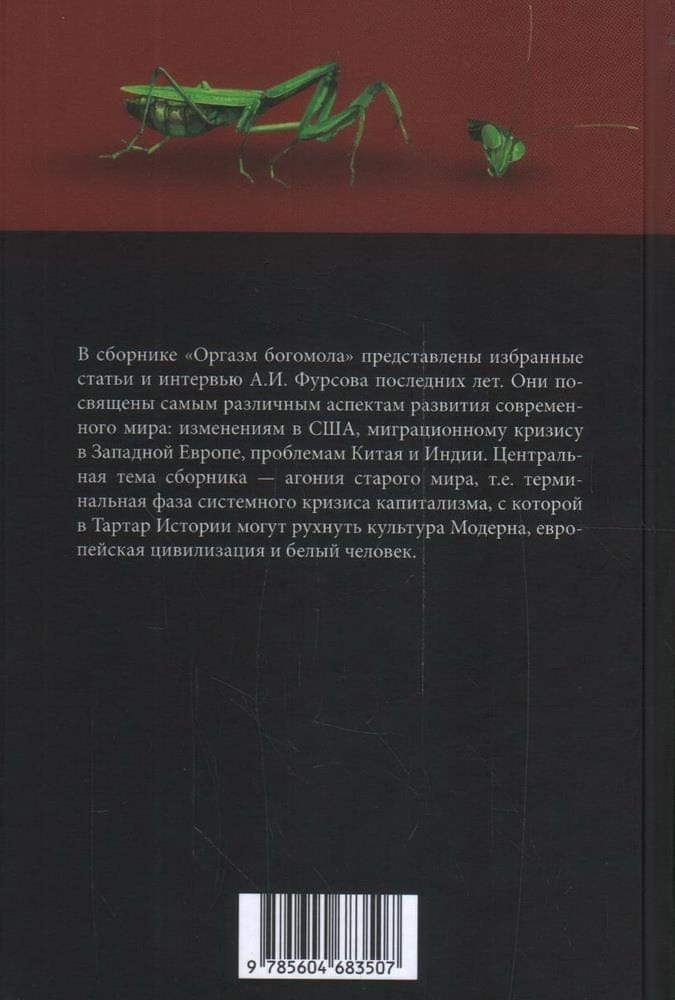 В сборнике «Оргазм богомола» представлены избранные статьи и интервью А. И. Фурсова последних лет. Они посвящены самым различным аспектам развития современного мира: изменениям в США, миграционному кризису в Западной Европе, проблемам Китая и Индии. Центральная тема сборника - агония старого мира, т.е. терминальная фаза системного кризиса капитализма, с которой в Тартар Истории могут рухнуть культура Модерна, европейская цивилизация и белый человек.