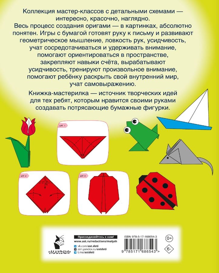 Перед вами практическое руководство с пошаговыми иллюстрациями, предназначенное для ребят, а также их родителей, которые никогда не складывали фигурки из бумаги! Процесс создания каждой бумажной фигурки подробно описан в пошаговой инструкции и сопровождается детальной схемой, понятной юным мастерам оригами.