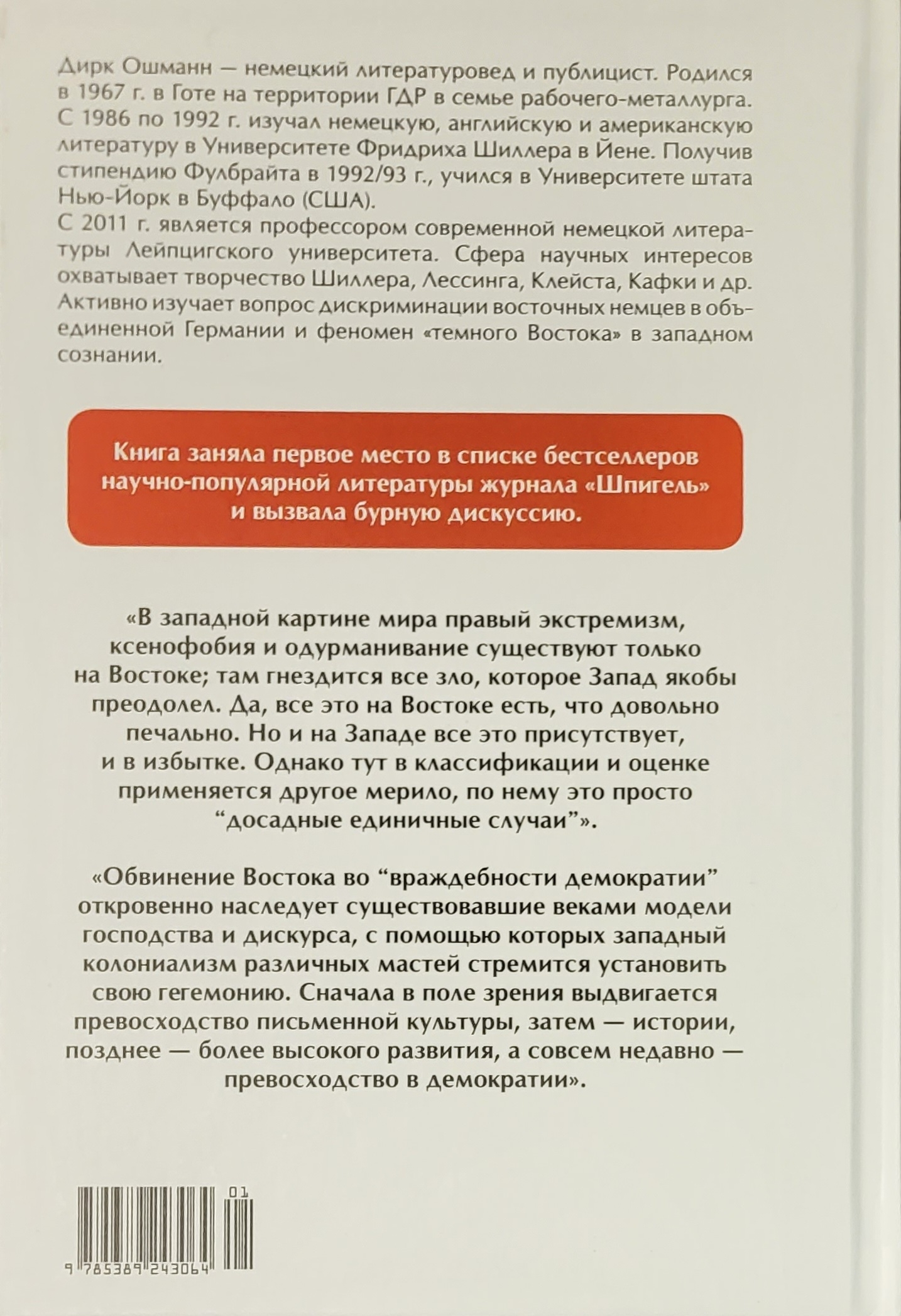 Что такое «Восток»? Географическая сторона света? Направление, зависящее от точки зрения наблюдателя? Колониальная окраина? Кто решает это и почему в устах Запада термин «Восток» часто выполняет функцию позорного клейма? Эта книга – дерзкий вызов. Ее автор, профессор немецкой литературы Лейпцигского университета Дирк Ошманн, посягнул на святая святых – право трактовать историю и современность единственно с точки зрения «победителя». На примере Западной и Восточной Германии он разбивает благостную картину мира западного интеллектуала, убежденного в том, что Восток хорош только тогда, когда полностью похож на Запад. В яркой полемичной манере автор показывает, что этот конфликт затрагивает весь современный мир, основанный на глобальном разломе общества, неравенстве культур, застарелых обидах и взаимных претензиях, зачастую проявляющихся сегодня в самых неприглядных, радикальных формах. Книга, вокруг которой в Германии кипят жаркие споры, несомненно, найдет отклик у читателя.