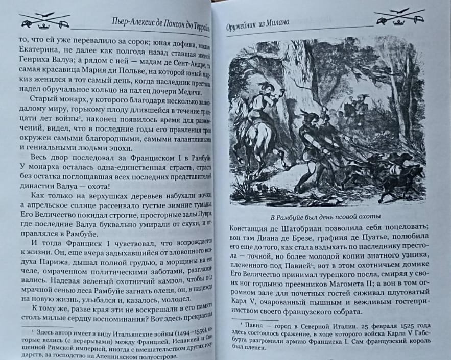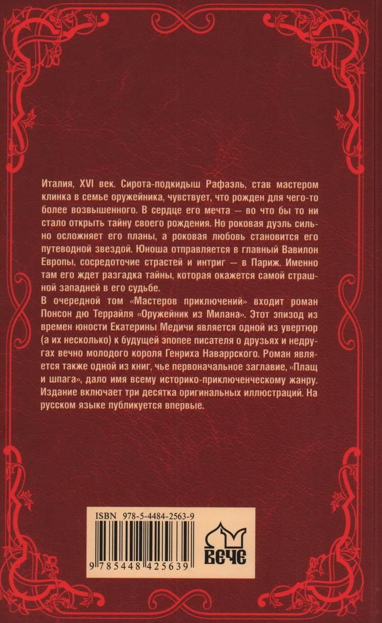 В очередной том «Мастеров приключений» входит роман Понсон дю Террайля «Оружейник из Милана». Этот эпизод из времен юности Екатерины Медичи является одной из увертюр (а их несколько) к будущей эпопее писателя о друзьях и недругах вечно молодого короля Генриха Наваррского. Роман является также одной из книг, чье первоначальное заглавие, «Плащ и шпага», дало имя всему историко-приключенческому жанру. Издание включает три десятка оригинальных иллюстраций.