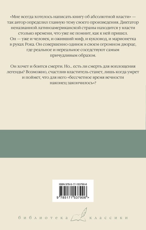 Габриэль Гарсиа Маркес – величайший писатель ХХ века, лауреат Нобелевской премии, автор всемирно известных романов «Сто лет одиночества», «Любовь во время чумы» и «Осень патриарха». «Мне всегда хотелось написать книгу об абсолютной власти», – так автор определил главную тему своего произведения. Диктатор неназванной латиноамериканской страны находится у власти столько времени, что уже не помнит, как к ней пришел. Он – уже и человек, и оживший миф, и кукловод, и марионетка в руках Рока. Он совершенно одинок в своем огромном дворце, где реальное и нереальное соседствуют самым причудливым образом. Он хочет и боится смерти. Но… есть ли смерть для воплощения легенды? Возможно, счастлив властитель станет лишь когда умрет и поймет, что для него «бессчетное время вечности наконец закончилось»?