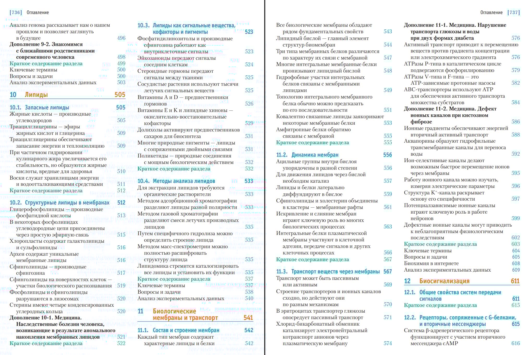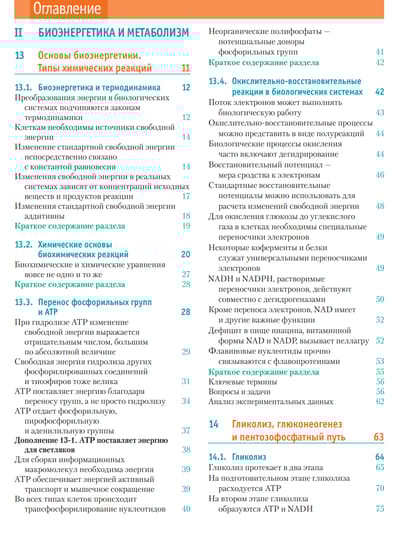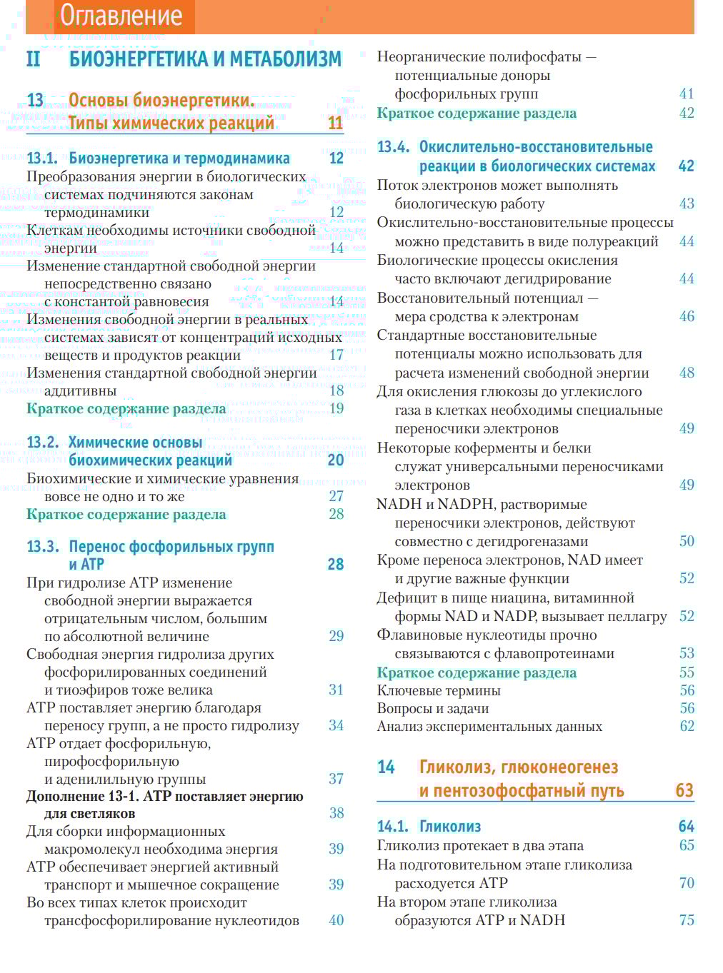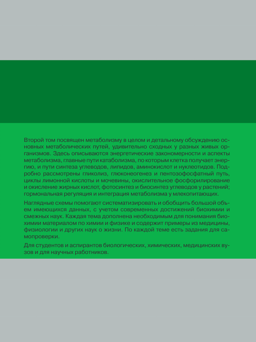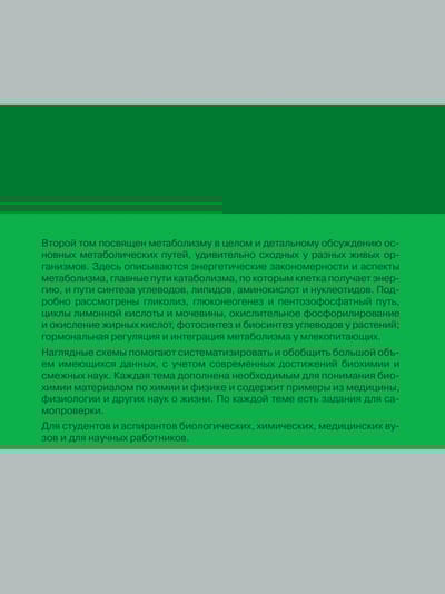 В том 2 вошла часть II «Биоэнергетика и метаболизм». Даны общие термодинамические понятия применительно к биологическим системам, классификация химических реакций, происходящих в живых организмах, подробно рассмотрены основные метаболические пути — гликолиз, глюконеогенез, пентозофосфатный путь, циклы лимонной кислоты и мочевины, окислительное фосфорилирование, фотосинтез и биосинтез углеводов у растений, процессы катаболизма и анаболизма аминокислот, липидов и нуклеотидов, а также принципы гормональной регуляции и интеграции метаболизма у млекопитающих. В каждой главе есть задания для самопроверки.