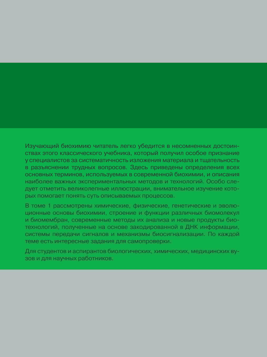 В томе 1 рассмотрены химические, физические, генетические и эво-люционные основы биохимии, строение и функции различных биомолекул и биомембран, современные методы их анализа и новые продукты биотехнологий, полученные на основе закодированной в ДНК информации, системы передачи сигналов и механизмы биосигнализации. В каждой главе есть задания для самопроверки.