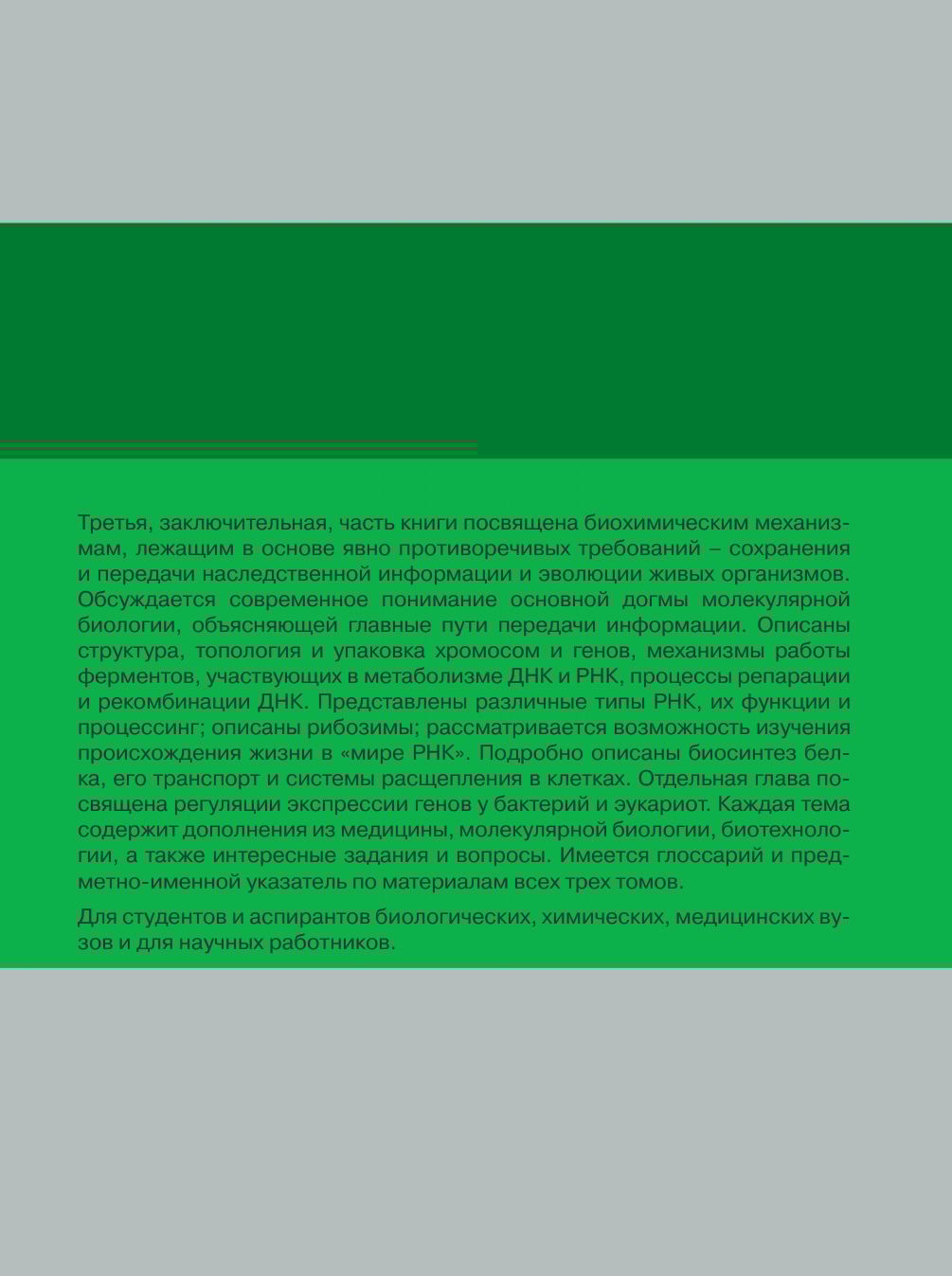 В том 3 вошли часть III «Пути передачи информации», краткие решения задач и ответы на вопросы, предметно-именной указатель по материалу томов 1–3, а также принятые сокращения и словарь терминов. Обсуждаются основная догма молекулярной биологии и ее современное понимание, процессы передачи и хранения генетической информации (репликация, транскрипция, трансляция, репарация и рекомбинация), строение хромосом, механизмы ферментативных процессов, функции различных РНК в клетке, рибозимы, сплайсинг, альтернативный сплайсинг, процессинг.