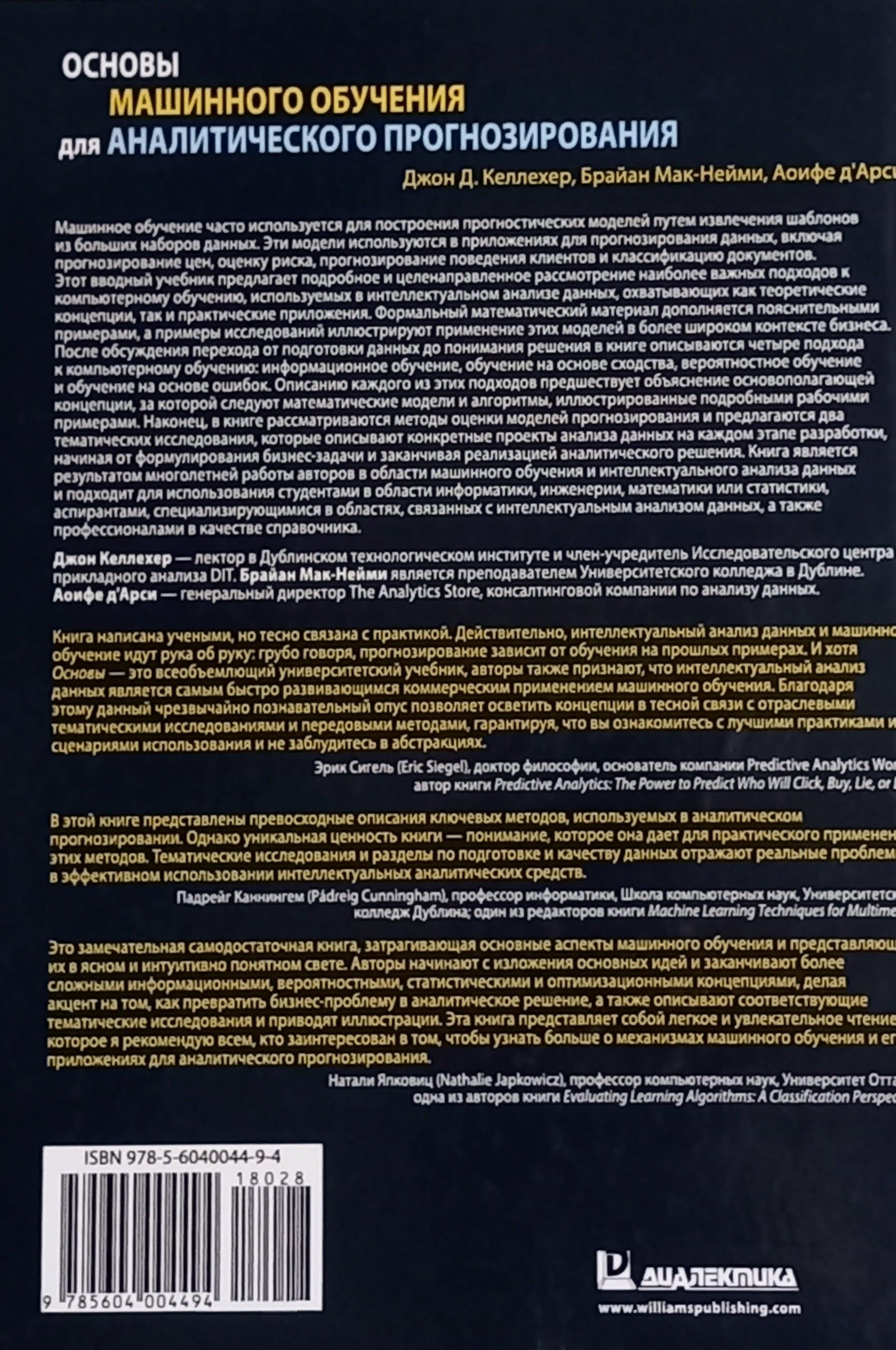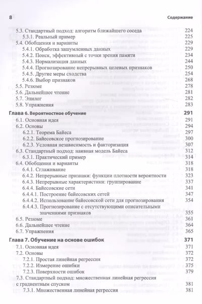 В книге рассмотрены информационное обучение, обучение на основе сходства, вероятностное обучение и обучение на основе ошибок. Описанию каждого из этих подходов предшествует объяснение основополагающей концепции, за которой следуют математические модели и алгоритмы, иллюстрированные подробными рабочими примерами.