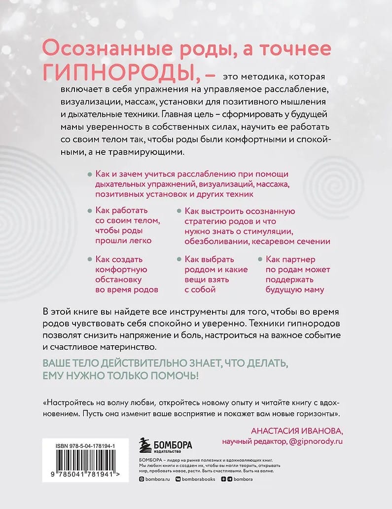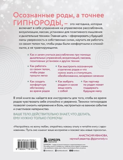 В книге есть практические занятия, техники управляемых релаксаций, списки вещей, которые могут пригодиться в день родов, и многое другое.