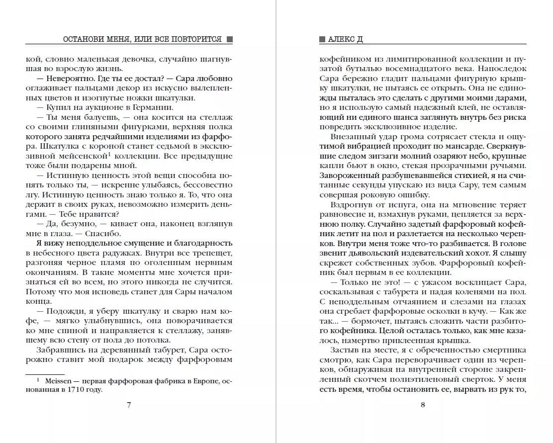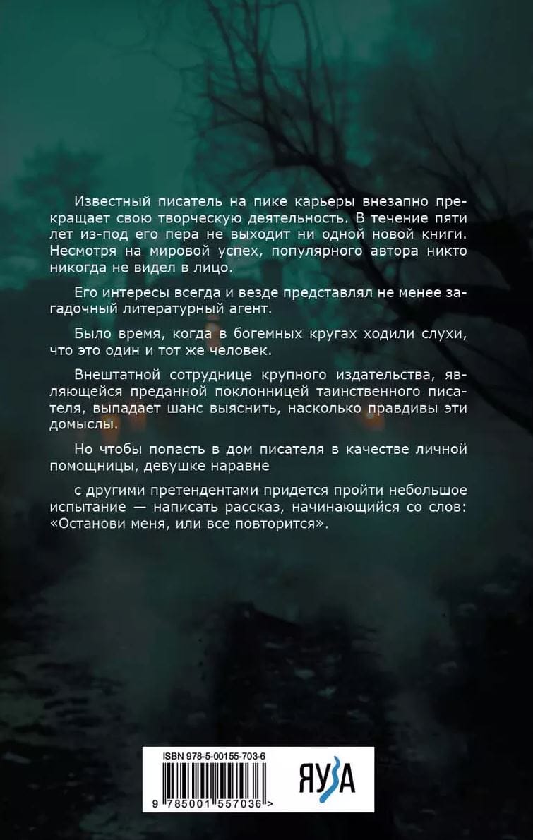 Известный писатель на пике карьеры внезапно прекращает свою творческую деятельность. В течение пяти лет из-под его пера не выходит ни одной новой книги. Несмотря на мировой успех, популярного автора никто никогда не видел в лицо. Его интересы всегда и везде представлял не менее загадочный литературный агент. Было время, когда в богемных кругах ходили слухи, что это один и тот же человек. Внештатной сотруднице крупного издательства, являющейся преданной поклонницей таинственного писателя, выпадает шанс выяснить, насколько правдивы эти домыслы. Но чтобы попасть в дом писателя в качестве личной помощницы, девушке наравне с другими претендентами придется пройти небольшое испытание — написать рассказ, начинающийся со слов: «Останови меня, или все повторится».