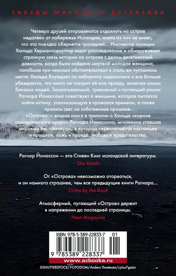 Четверо друзей отправляются отдохнуть на остров недалеко от побережья Исландии, никто из них не знает, что эта поездка обернется трагедией... Инспектор полиции Хюльда Херманнсдоуттир ведет расследование и обнаруживает странную связь истории на острове с делом десятилетней давности, когда была найдена мертвой молодая женщина, погибшая при неясных обстоятельствах в столь же пустынном месте. Хюльда блуждает по лабиринту недомолвок и все больше убеждается, что никто не говорит ей всю правду, включая самых близких людей. Захватывающий, тревожный и пугающий роман Рагнара Йонассона повествует о женщине, которая пытается найти истину, ускользающую в провалах времени, а также пролить свет на собственное прошлое. «Остров» — вторая книга в трилогии о Хюльде «короля скандинавского нуара» Рагнара Йонассона, мгновенно ставшая мировым бестселлером, в котором переплетаются настоящее и прошлое, ложь и правда, любовь и предательство.