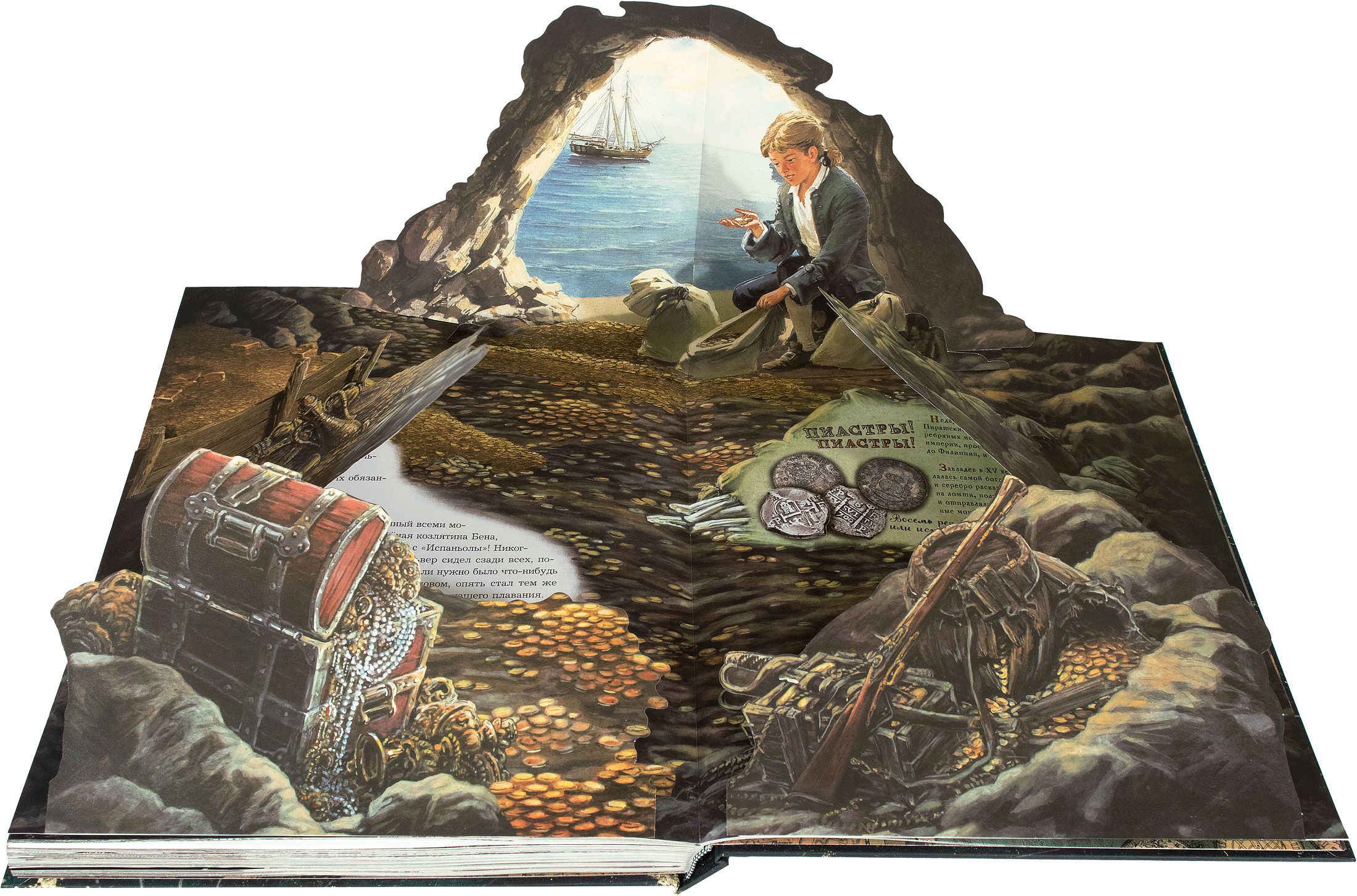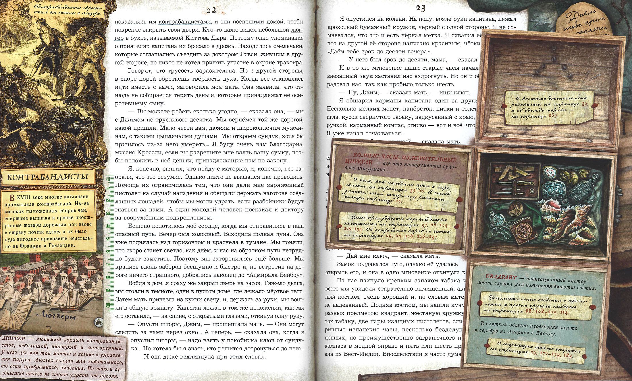 Знаменитый роман Роберта Льюиса Стивенсона в сопровождении подробного историко-бытового комментария, посвященного морскому делу в Англии XVIII века и «золотому веку» пиратства. Рисунки, гравюры, карты, страницы из книг того времени, интерактивные элементы помогают воссоздать живую атмосферу эпохи.