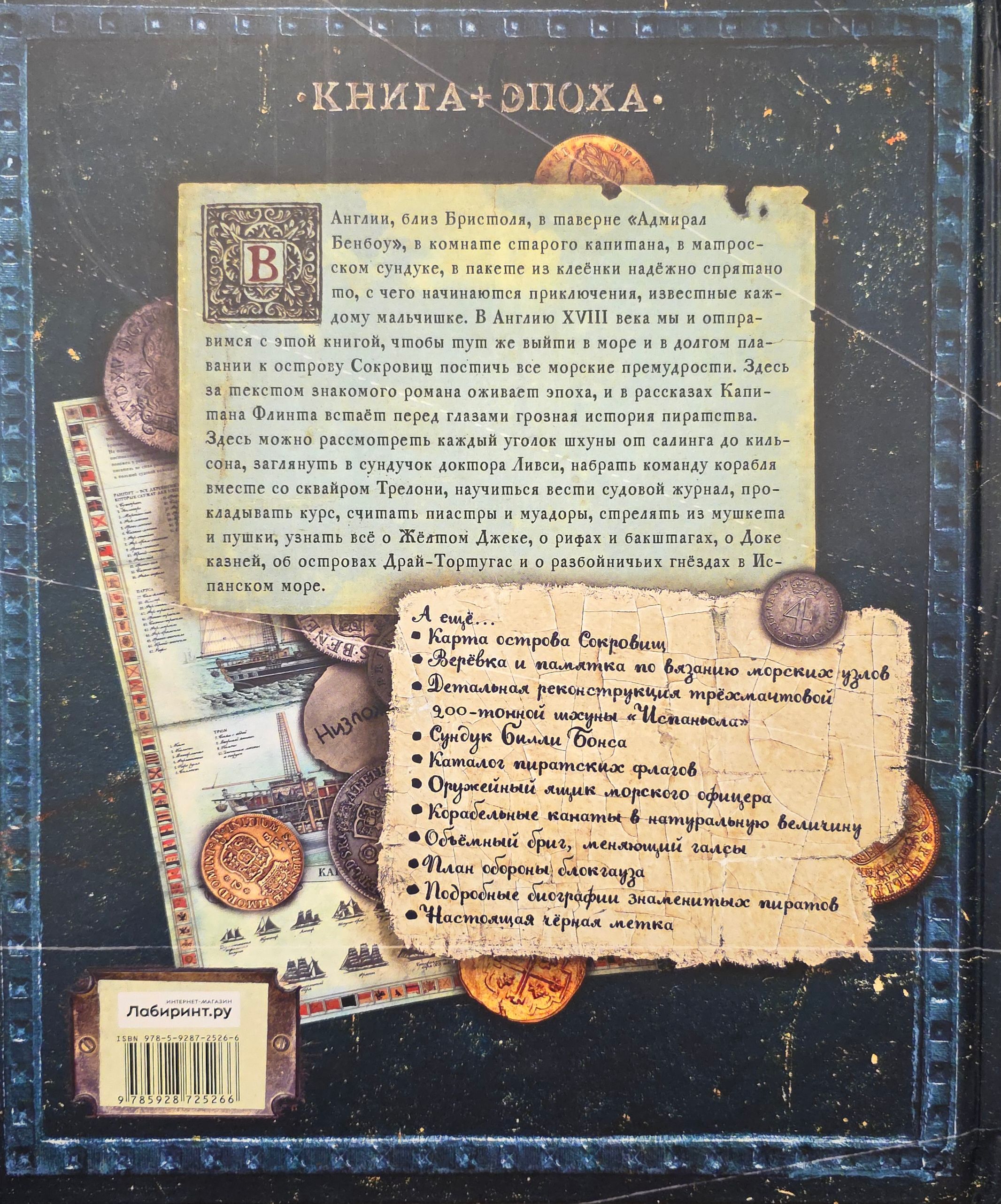 В Англии, близ Бристоля, в таверне «Адмирал Бенбоу», в комнате старого капитана, в матросском сундуке, в пакете из клеенки надежно спрятано то, с чего начинаются приключения, известные каждому мальчишке. В Англию XVIII века мы отправимся с этой книгой, чтобы тут же выйти в море и в долгом плавании к острову Сокровищ постичь все морские премудрости. Здесь за текстом знакомого романа оживает эпоха, а в рассказах Капитана Флинта встает перед глазами грозная история пиратства. Здесь можно рассмотреть каждый уголок шхуны от салинга до кильсона, заглянуть в сундучок доктора Ливси, набрать команду корабля вместе со сквайром Трелони, научиться вести судовой журнал, прокладывать курс, считать пиастры и муадоры, стрелять из мушкета и пушки, узнать все о Желтом Джеке, о рифах и бакштагах, о Доке казней, об островах Драй-Тортугас и о разбойничьих гнездах в Испанском море.