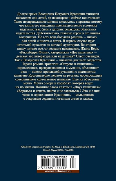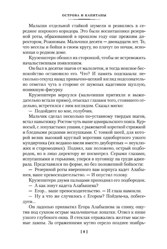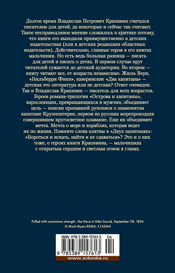 Долгое время Владислав Петрович Крапивин считался писателем для детей, да некоторые и сейчас так считают. Такое несправедливое мнение сложилось в критике потому, что книги его выходили преимущественно в детских издательствах (или в детских редакциях областных издательств). Действительно, главные герои в его книгах мальчишки, а раз так, то где же его печатать как не в детских изданиях. Но есть ведь большая разница — писать для детей и писать о детях. В первом случае круг читателей сужается до детской аудитории. Во втором — книгу читают все, от возраста независимо. Аркадий Гайдар, "Гекльберри Финн", каверинские "Два капитана" — детская это литература или не детская? Ответ, по-моему, очевиден. Тоже и Владислав Крапивин — писатель для всех возрастов.   Героев романа-трилогии "Острова и капитаны", взрослеющих, превращающихся в мужчин, объединяет цель — поиски пропавшей рукописи о знаменитом капитане Крузенштерне, первом из русских морепроходцев совершившем кругосветное плавание. Еще их объединяет мечта. Мечта о море и кораблях, которая ведет их по жизни. Помните слова клятвы в "Двух капитанах": "Бороться и искать, найти и не сдаваться"? Это и о них тоже, о героях книги Крапивина, — мальчишках с открытым сердцем и светлым огнем в глазах.