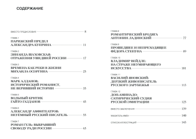 В центре внимания — фигуры Марка Алданова, Владимира Вейдле, Гайто Газданова, Александра Куприна, Михаила Осоргина, Фёдора Степуна и других, чьи судьбы и творчество переплелись в истории и на страницах этой книги. Автор видит свою задачу в том, чтобы вернуть читателю эту неотъемлемую часть национальной культуры.