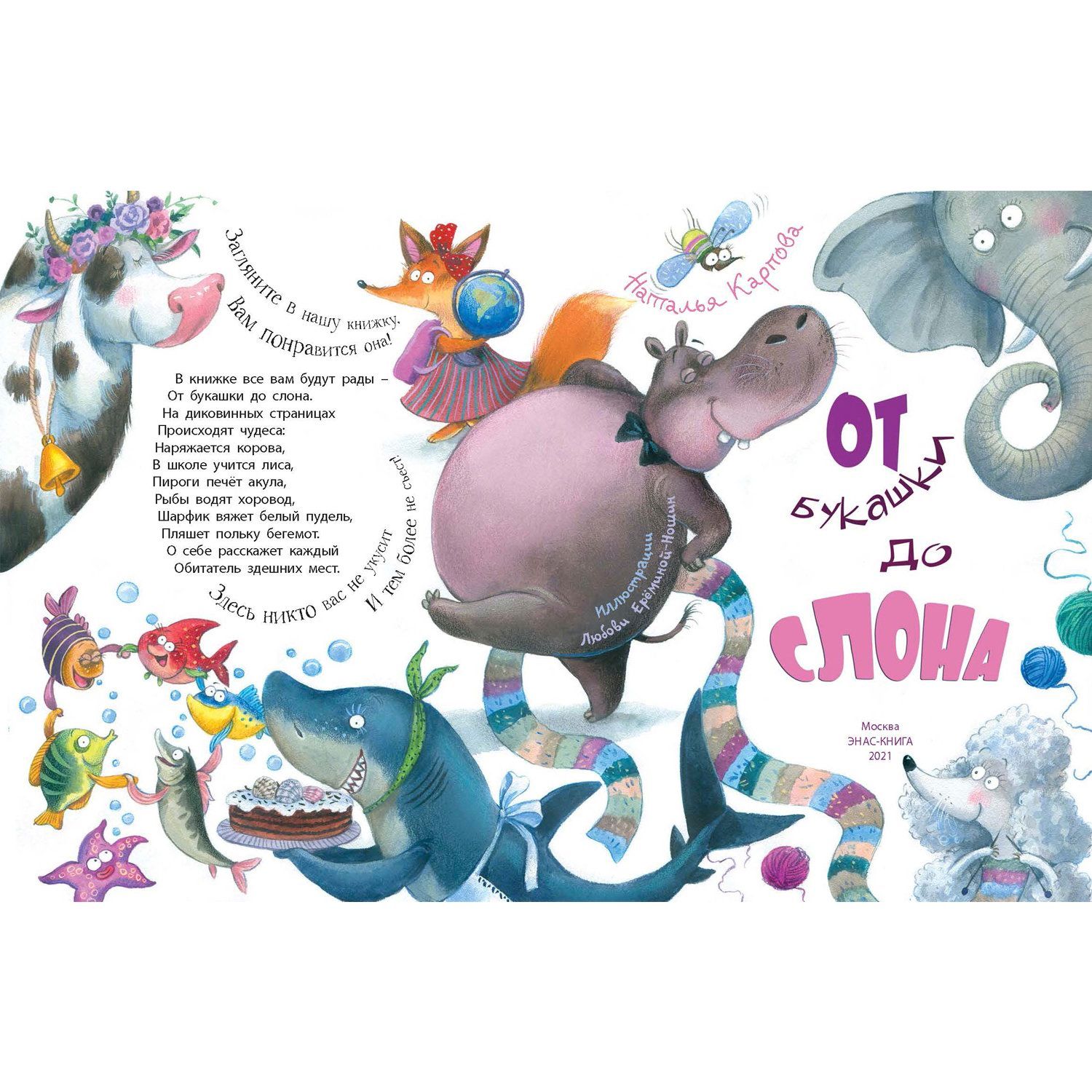 Откройте эту книжку – и вы тут же попадёте в удивительную страну. Кого тут только нет! И о себе расскажет каждый обитатель здешних мест. Здесь акула умеет печь пироги, жираф принимает тропический душ, а ещё в ней живёт самый добрый на свете слон! Весёлые стихи Натальи Карповой и нежные иллюстрации Любови Ерёминой-Ношин обязательно понравятся детям и их родителям! Для чтения взрослыми детям.